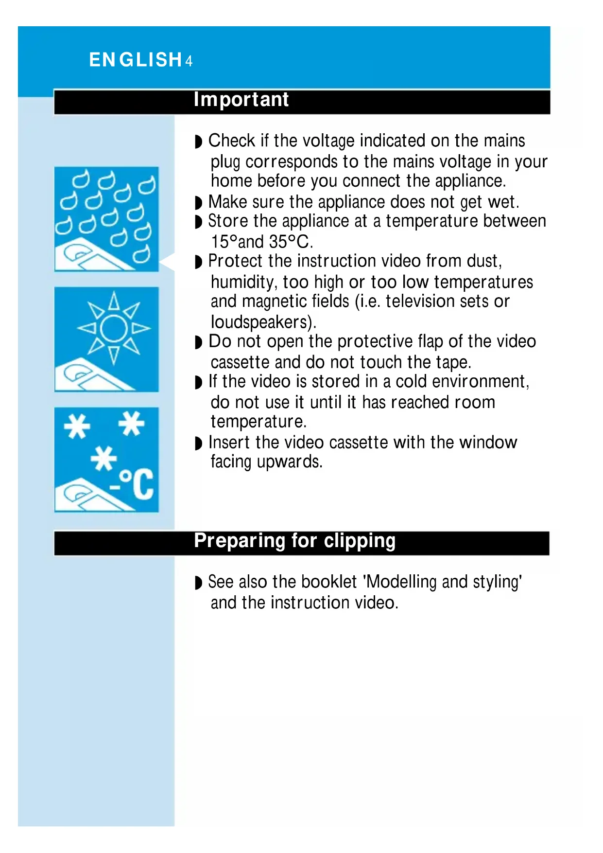 Make sure the appliance does not get wet. - Store the appliance at a temperature between 15^ and 35^ C.