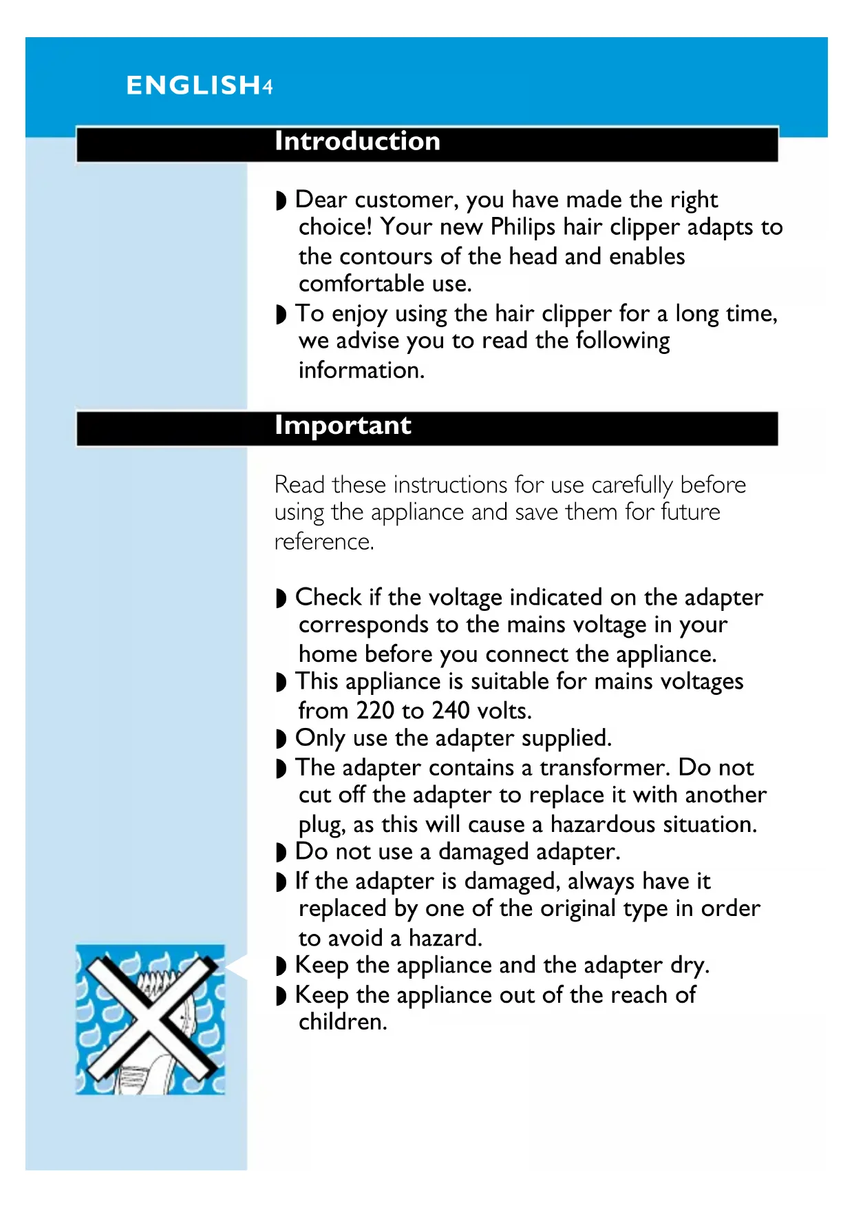 HQC483Introduction ◗ Dear customer, you have made the right choice! Your new Philips hair clipper adapts to the contours of the head and enables comfortable use. ◗ To enjoy using the hair clipper for a long time, we advise you to read the following information. Important Read these instructions for use carefully before using the appliance and save them for future reference. ◗ Check if the voltage indicated on the adapter corresponds to the mains voltage in your home before you connect the appliance. ◗ This appliance is suitable for mains voltages from 220 to 240 volts. ◗ Only use the adapter supplied. ◗ The adapter contains a transformer. Do not cut off the adapter to replace it with another plug, as this will cause a hazardous situation. ◗ Do not use a damaged adapter. ◗ If the adapter is damaged, always have it replaced by one of the original type in order to avoid a hazard.