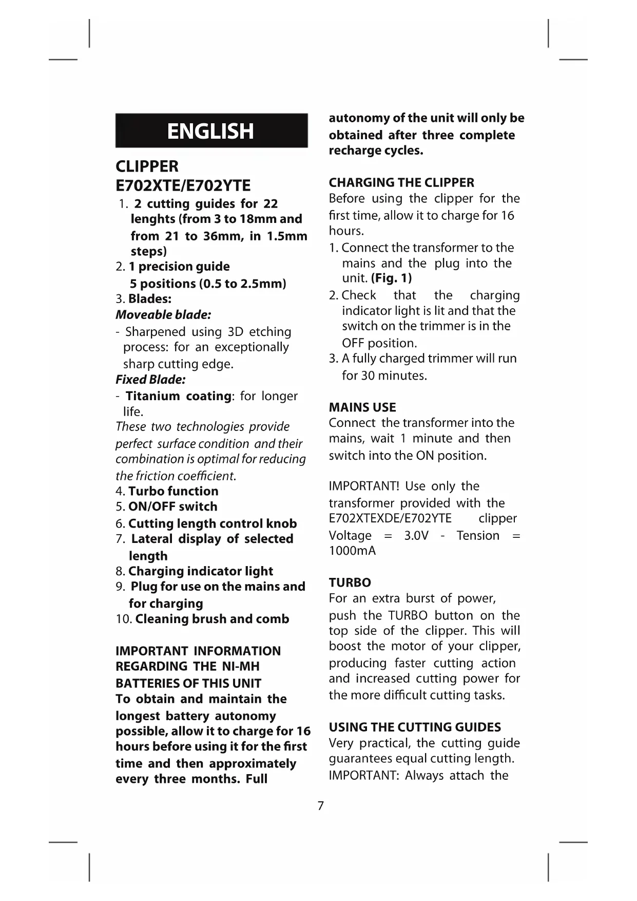 for 30 minutes. MAINS USE Connect the transformer into the mains, wait 1 minute and then switch into the ON position. IMPORTANT! Use only the transformer provided with the E702XTEXDE/E702YTE clipper Voltage = 3.0V - Tension = 1000mA TURBO For an extra burst of power, push the TURBO button on the top side of the clipper. This will boost the motor of your clipper, producing faster cutting action and increased cutting power for the more dicult cutting tasks.