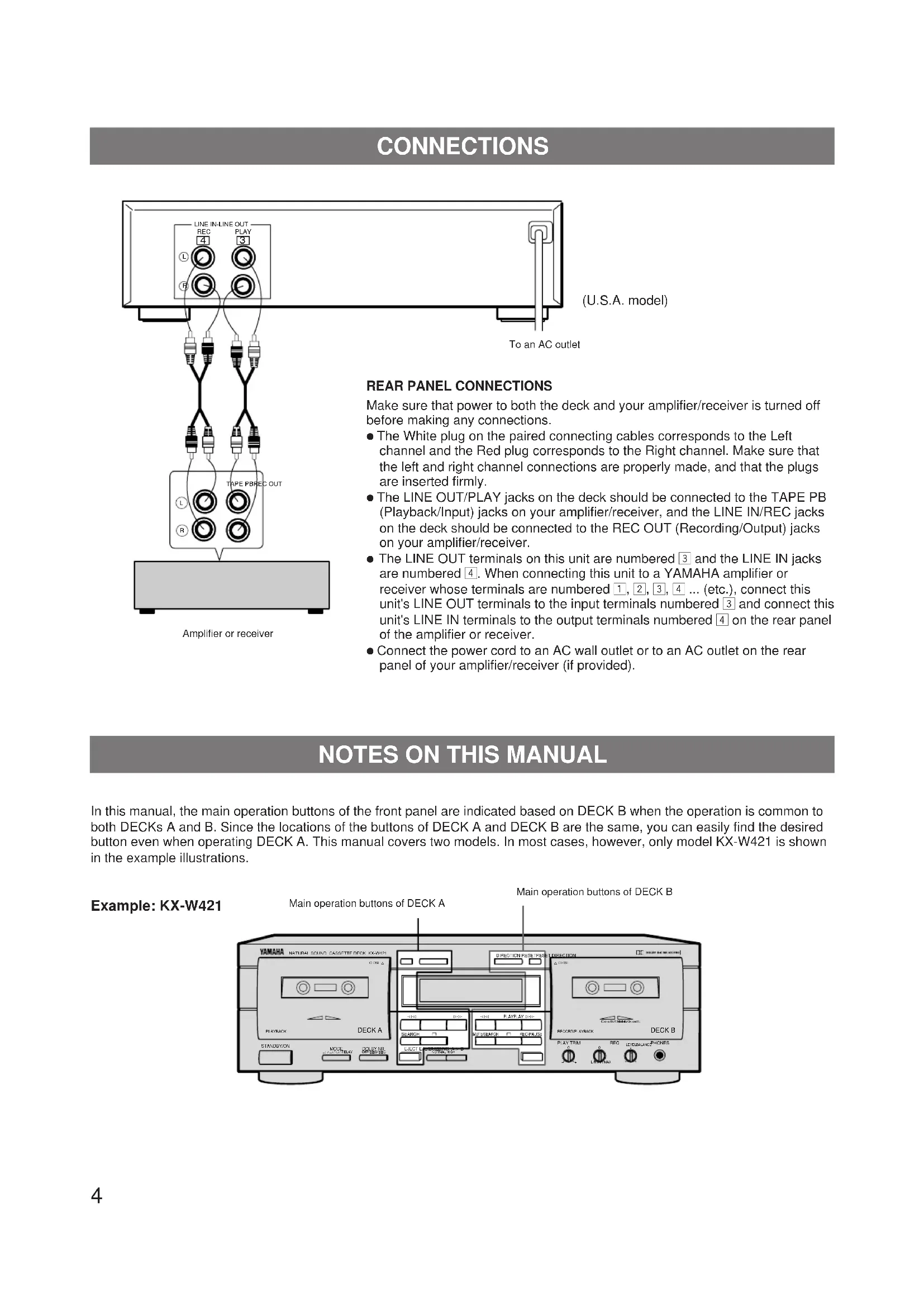 Make sure that power to both the deck and your amplifier/receiver is turned off before making any connections. ÷ The White plug on the paired connecting cables corresponds to the Left channel and the Red plug corresponds to the Right channel. Make sure that the left and right channel connections are properly made, and that the plugs are inserted firmly. ÷ The LINE OUT/PLAY jacks on the deck should be connected to the TAPE PB (Playback/Input) jacks on your amplifier/receiver, and the LINE IN/REC jacks on the deck should be connected to the REC OUT (Recording/Output) jacks on your amplifier/receiver. ÷ The LINE OUT terminals on this unit are numbered 3 and the LINE IN jacks are numbered 4. When connecting this unit to a YAMAHA amplifier or receiver whose terminals are numbered 1, 2, 3, 4 ... (etc.), connect this unit's LINE OUT terminals to the input terminals numbered 3 and connect this unit's LINE IN terminals to the output terminals numbered 4 on the rear panel of the amplifier or receiver. ÷ Connect the power cord to an AC wall outlet or to an AC outlet on the rear panel of your amplifier/receiver (if provided). NATURAL SOUND CASSETTE DECK KX-W421DOLBY NR