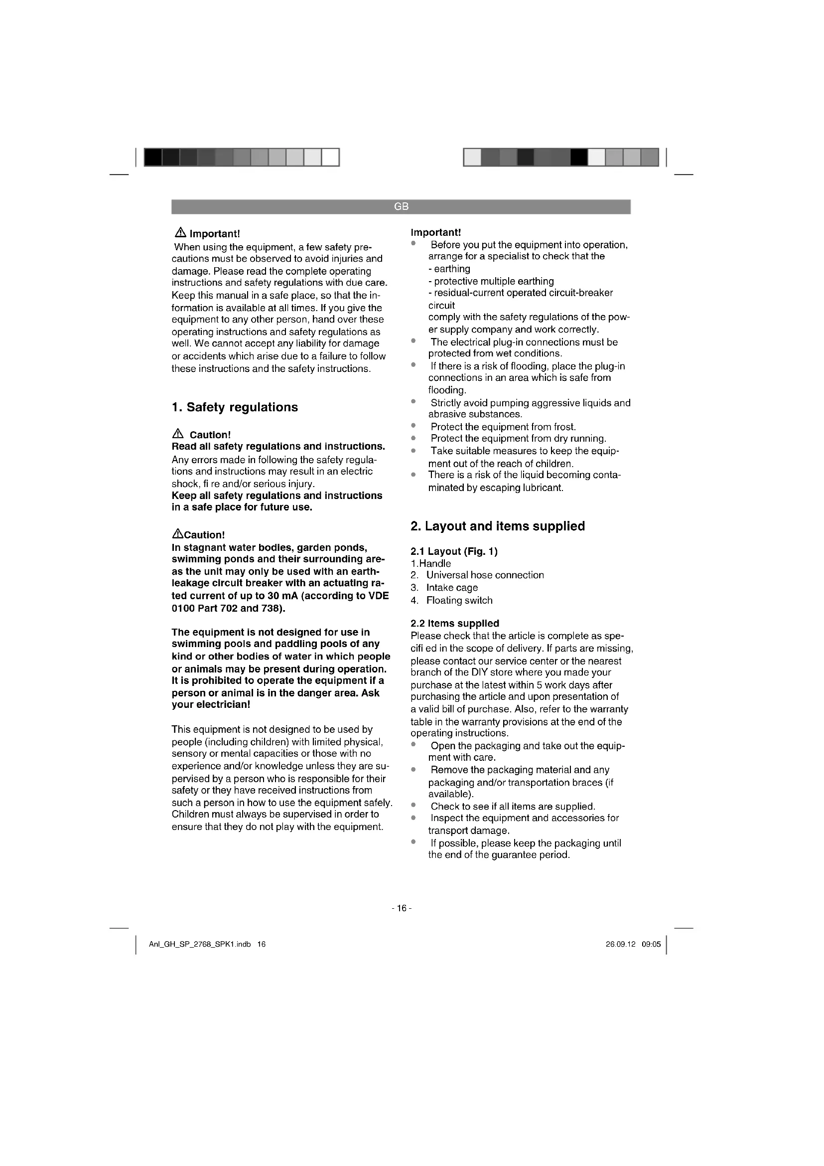 Caution! Read all safety regulations and instructions. Any errors made in following the safety regula- tions and instructions may result in an electric shock, fi re and/or serious injury. Keep all safety regulations and instructions in a safe place for future use. Caution! In stagnant water bodies, garden ponds, swimming ponds and their surrounding are- as the unit may only be used with an earth- leakage circuit breaker with an actuating ra- ted current of up to 30 mA (according to VDE 0100 Part 702 and 738). The equipment is not designed for use in swimming pools and paddling pools of any kind or other bodies of water in which people or animals may be present during operation. It is prohibited to operate the equipment if a person or animal is in the danger area. Ask your electrician! This equipment is not designed to be used by people (including children) with limited physical, sensory or mental capacities or those with no experience and/or knowledge unless they are su- pervised by a person who is responsible for their safety or they have received instructions from such a person in how to use the equipment safely. Children must always be supervised in order to ensure that they do not play with the equipment. Important!