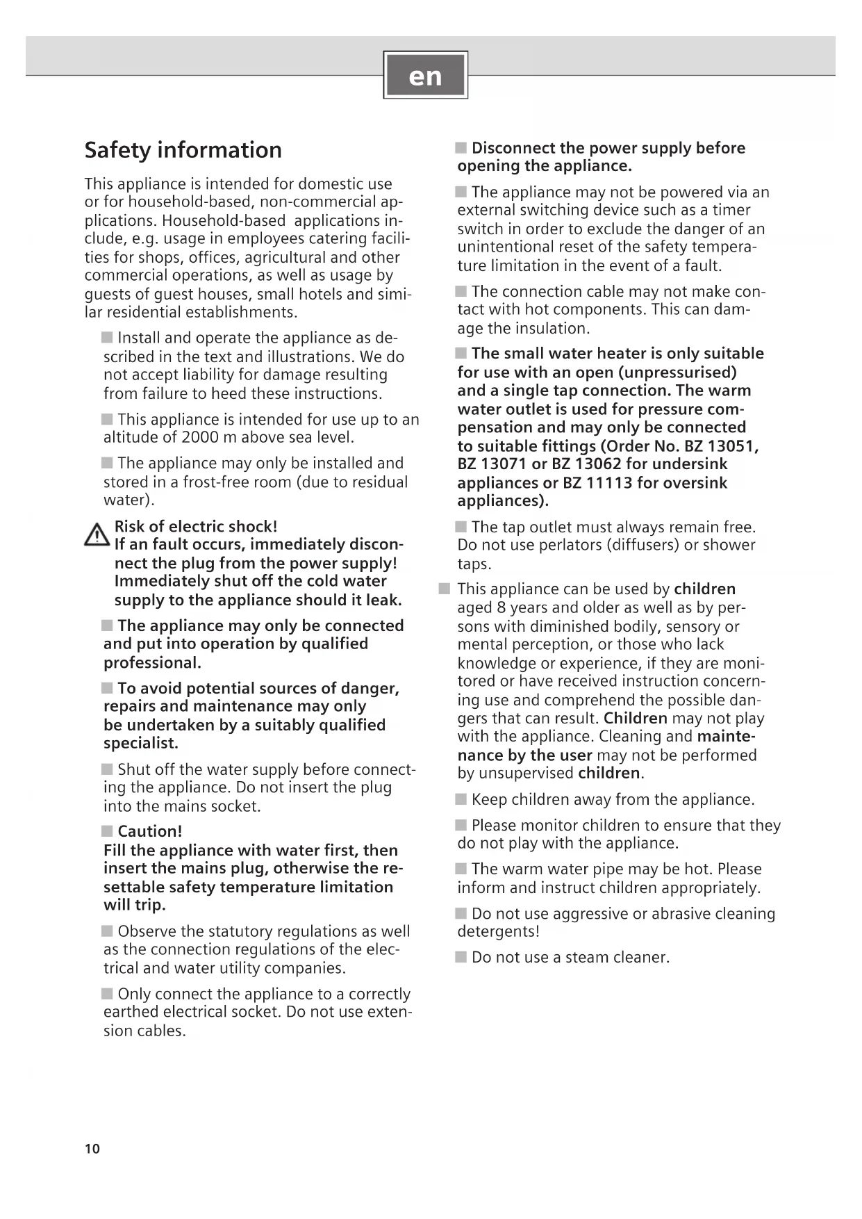 Safety information This appliance is intended for domestic use or for household-based, non-commercial ap- plications. Household-based applications in- clude, e.g. usage in employees catering facili- ties for shops, offices, agricultural and other commercial operations, as well as usage by guests of guest houses, small hotels and simi- lar residential establishments. ■ Install and operate the appliance as de- scribed in the text and illustrations. We do not accept liability for damage resulting from failure to heed these instructions. ■ This appliance is intended for use up to an altitude of 2000 m above sea level. ■ The appliance may only be installed and stored in a frost-free room (due to residual water). Risk of electric shock! If an fault occurs, immediately discon- nect the plug from the power supply! Immediately shut off the cold water supply to the appliance should it leak. ■ The appliance may only be connected and put into operation by qualified professional. ■ To avoid potential sources of danger, repairs and maintenance may only be undertaken by a suitably qualified specialist. ■ Shut off the water supply before connect- ing the appliance. Do not insert the plug into the mains socket. ■ Caution! Fill the appliance with water first, then insert the mains plug, otherwise the re- settable safety temperature limitation will trip. ■ Observe the statutory regulations as well as the connection regulations of the elec- trical and water utility companies. ■ Only connect the appliance to a correctly earthed electrical socket. Do not use exten- sion cables. ■ Disconnect the power supply before opening the appliance. ■ The appliance may not be powered via an external switching device such as a timer switch in order to exclude the danger of an unintentional reset of the safety tempera- ture limitation in the event of a fault. ■ The connection cable may not make con- tact with hot components. This can dam- age the insulation. ■ The small water heater is only suitable for use with an open (unpressurised) and a single tap connection. The warm water outlet is used for pressure com- pensation and may only be connected to suitable fittings (Order No. BZ 13051, BZ 13071 or BZ 13062 for undersink appliances or BZ 11113 for oversink appliances). ■ The tap outlet must always remain free. Do not use perlators (diffusers) or shower taps. ■ This appliance can be used by children aged 8 years and older as well as by per- sons with diminished bodily, sensory or mental perception, or those who lack knowledge or experience, if they are moni- tored or have received instruction concern- ing use and comprehend the possible dan- gers that can result. Children may not play with the appliance. Cleaning and mainte- nance by the user may not be performed by unsupervised children. ■ Keep children away from the appliance. ■ Please monitor children to ensure that they do not play with the appliance. ■ The warm water pipe may be hot. Please inform and instruct children appropriately. ■ Do not use aggressive or abrasive cleaning detergents! ■ Do not use a steam cleaner.11