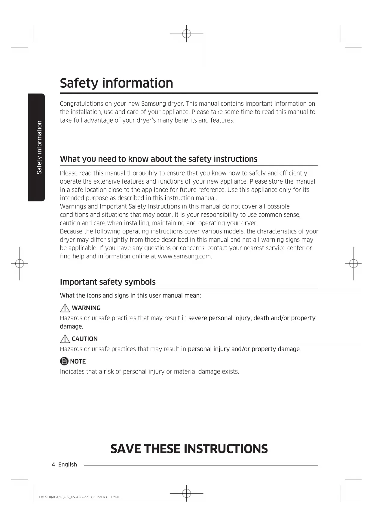 Safety information Congratulations on your new Samsung dryer. This manual contains important information on the installation, use and care of your appliance. Please take some time to read this manual to take full advantage of your dryer’s many benets and features. What you need to know about the safety instructions Please read this manual thoroughly to ensure that you know how to safely and efciently operate the extensive features and functions of your new appliance. Please store the manual in a safe location close to the appliance for future reference. Use this appliance only for its intended purpose as described in this instruction manual. Warnings and Important Safety Instructions in this manual do not cover all possible conditions and situations that may occur. It is your responsibility to use common sense, caution and care when installing, maintaining and operating your dryer. Because the following operating instructions cover various models, the characteristics of your dryer may differ slightly from those described in this manual and not all warning signs may be applicable. If you have any questions or concerns, contact your nearest service center or nd help and information online at www.samsung.com. Important safety symbols What the icons and signs in this user manual mean: WARNING Hazards or unsafe practices that may result in severe personal injury, death and/or property damage. CAUTION Hazards or unsafe practices that may result in personal injury and/or property damage. NOTE Indicates that a risk of personal injury or material damage exists. DV7700J-03170Q-05_EN-US.indd 4 2015/11/3 11:28:01English 5 Safety information