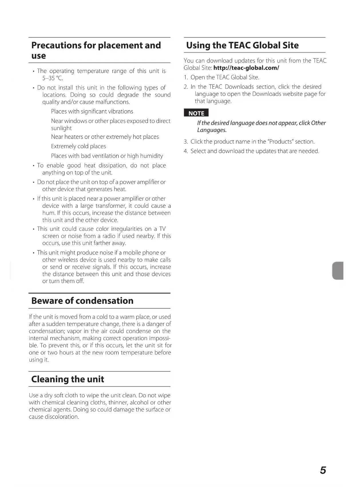 - This unit might produce noise if a mobile phone or other wireless device is used nearby to make calls or send or receive signals. If this occurs, increase the distance between this unit and those devices or turn them off. Beware of condensation If the unit is moved from a cold to a warm place, or used after a sudden temperature change, there is a danger of condensation; vapor in the air could condense on the internal mechanism, making correct operation impossi- ble. To prevent this, or if this occurs, let the unit sit for one or two hours at the new room temperature before using it. Cleaning the unit Use a dry soft cloth to wipe the unit clean. Do not wipe with chemical cleaning cloths, thinner, alcohol or other chemical agents. Doing so could damage the surface or cause discoloration. Using the TEAC Global Site You can download updates for this unit from the TEAC Global Site: http://teac-global.com/