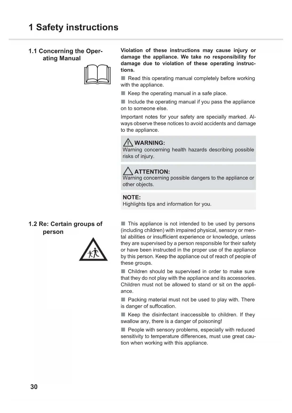 person This appliance is not intended to be used by persons(including children) with impaired physical, sensory or men-tal abilities or insufficient experience or knowledge, unlessthey are supervised by a person responsible for their safetyor have been instructed in the proper use of the applianceby this person. Keep the appliance out of reach of people ofthese groups. Children should be supervised in order to make surethat they do not play with the appliance and its accessories.Children must not be allowed to stand or sit on the appli-ance. Packing material must not be used to play with. Thereis danger of suffocation. Keep the disinfectant inaccessible to children. If theyswallow any, there is a danger of poisoning! People with sensory problems, especially with reducedsensitivity to temperature differences, must use great cau-tion when working with this appliance.