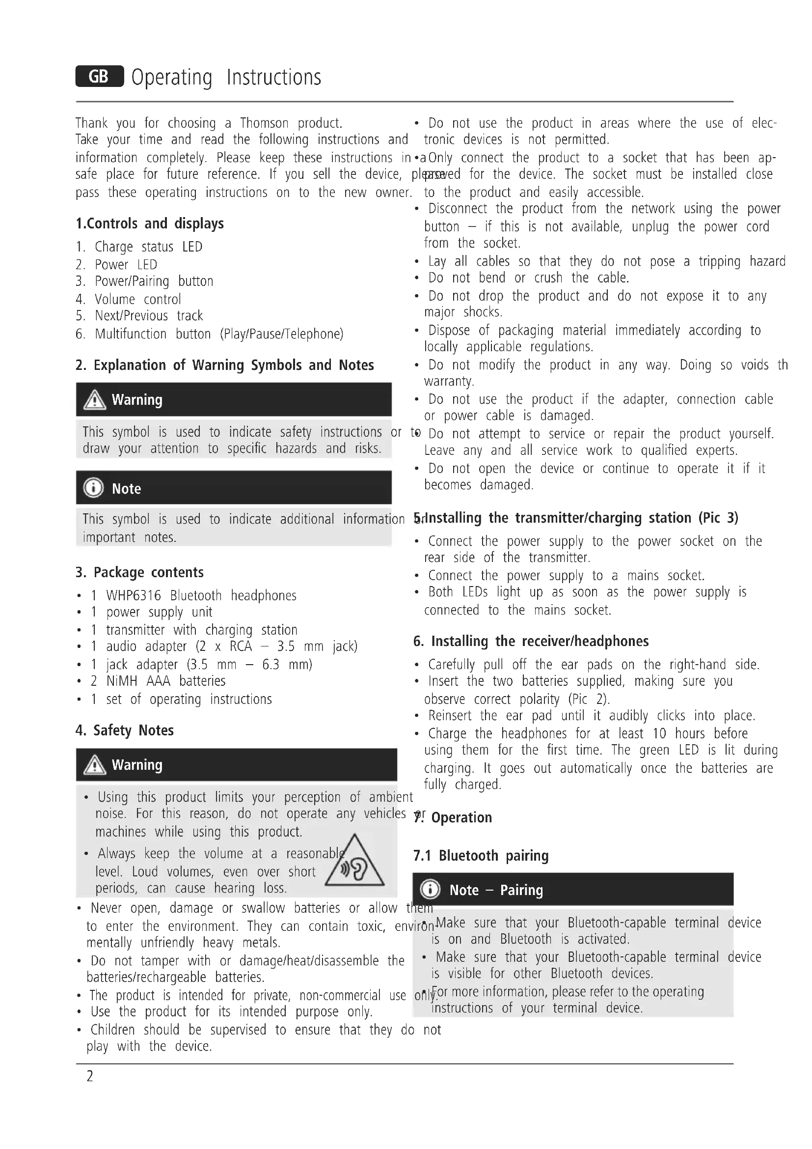 You can use the headphones as a hands-free set for your smartphone if your terminal device supports it. Press the Multifunction button once to answer an incoming call. Press the Multifunction button again to end the call. Note Whenever you want to charge the headphones, please switch them off rst by holding the Power button for about 3 seconds. For a complete restart, please disconnect the charging station from the mains supply.