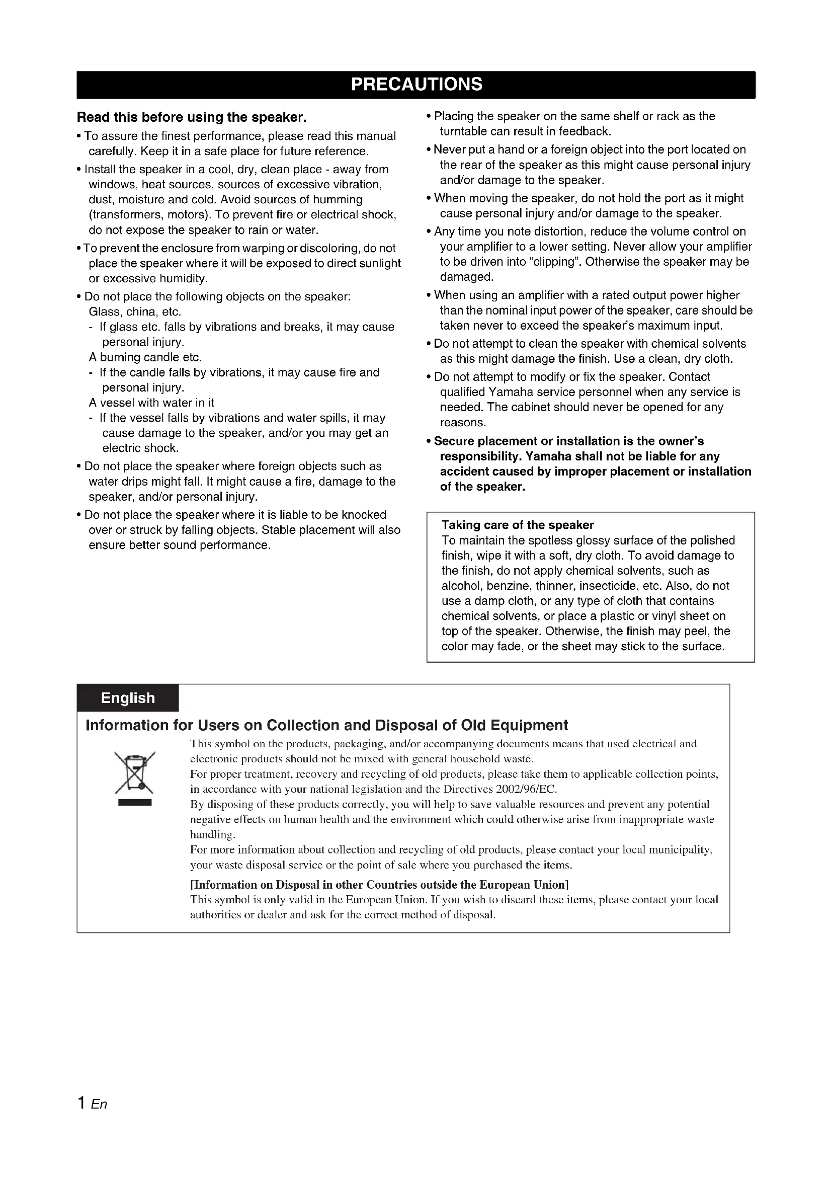 - Secure placement or installation is the owner’s responsibility. Yamaha shall not be liable for any accident caused by improper placement or installation of the speaker. PRECAUTIONS Taking care of the speaker To maintain the spotless glossy surface of the polished finish, wipe it with a soft, dry cloth. To avoid damage to the finish, do not apply chemical solvents, such as alcohol, benzine, thinner, insecticide, etc. Also, do not use a damp cloth, or any type of cloth that contains chemical solvents, or place a plastic or vinyl sheet on top of the speaker. Otherwise, the finish may peel, the color may fade, or the sheet may stick to the surface. English Information for Users on Collection and Disposal of Old Equipment This symbol on the products, packaging, and/or accompanying documents means that used electrical and electronic products should not be mixed with general household waste. For proper treatment, recovery and recycling of old products, please take them to applicable collection points, in accordance with your national legislation and the Directives 2002/96/EC. By disposing of these products correctly, you will help to save valuable resources and prevent any potential negative effects on human health and the environment which could otherwise arise from inappropriate waste handling. For more information about collection and recycling of old products, please contact your local municipality, your waste disposal service or the point of sale where you purchased the items. [Information on Disposal in other Countries outside the European Union] This symbol is only valid in the European Union. If you wish to discard these items, please contact your local authorities or dealer and ask for the correct method of disposal.2 En English The grille is detached from the speaker and packed separately. Be careful not to lose it. Place the speakers on a sturdy, vibration-free surface, or on a well-built stand. ■ Using as 2ch stereo speakers Better stereo images will be obtained when the speakers are slightly angled in towards the listeners. ■ Using as front speakers in a multi channel system Position the speakers on both sides of the TV. The positioning of speakers is important, because it controls the whole sound quality of a multi channel system. Set up the speakers on the basis of your listening position by following the owner’s manual supplied with your amplifier. Placing the speakers too close to a CRT-type TV may impair the picture color or cause a buzzing noise. In this case, move the speakers at least 20 cm (8") away from the TV. This is not an issue with LCD and plasma TVs.
