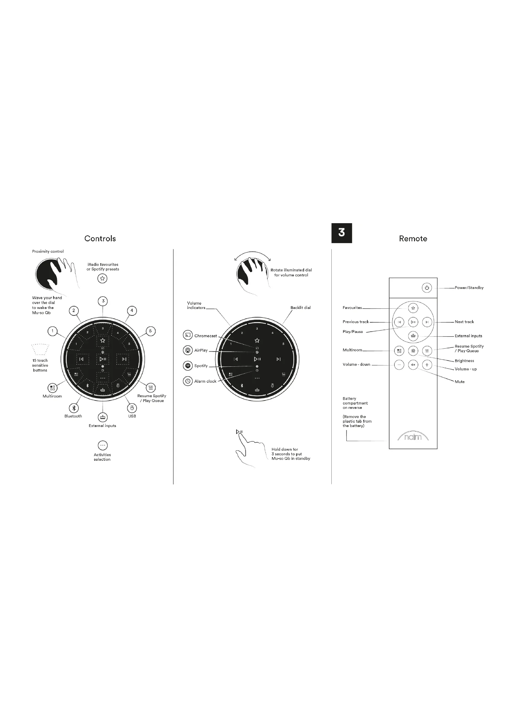 Controls iRadio favourites or Spotify presets Volume indicators Backlit dial Chromecast AirPlay Spotify Alarm clock External inputs Multiroom Bluetooth Rotate illuminated dial for volume control Proximity control 15 touch sensitive buttons Activities selection USB Hold down for 3 seconds to put Mu-so Qb in standby Wave your hand over the dial to wake the Mu-so Qb