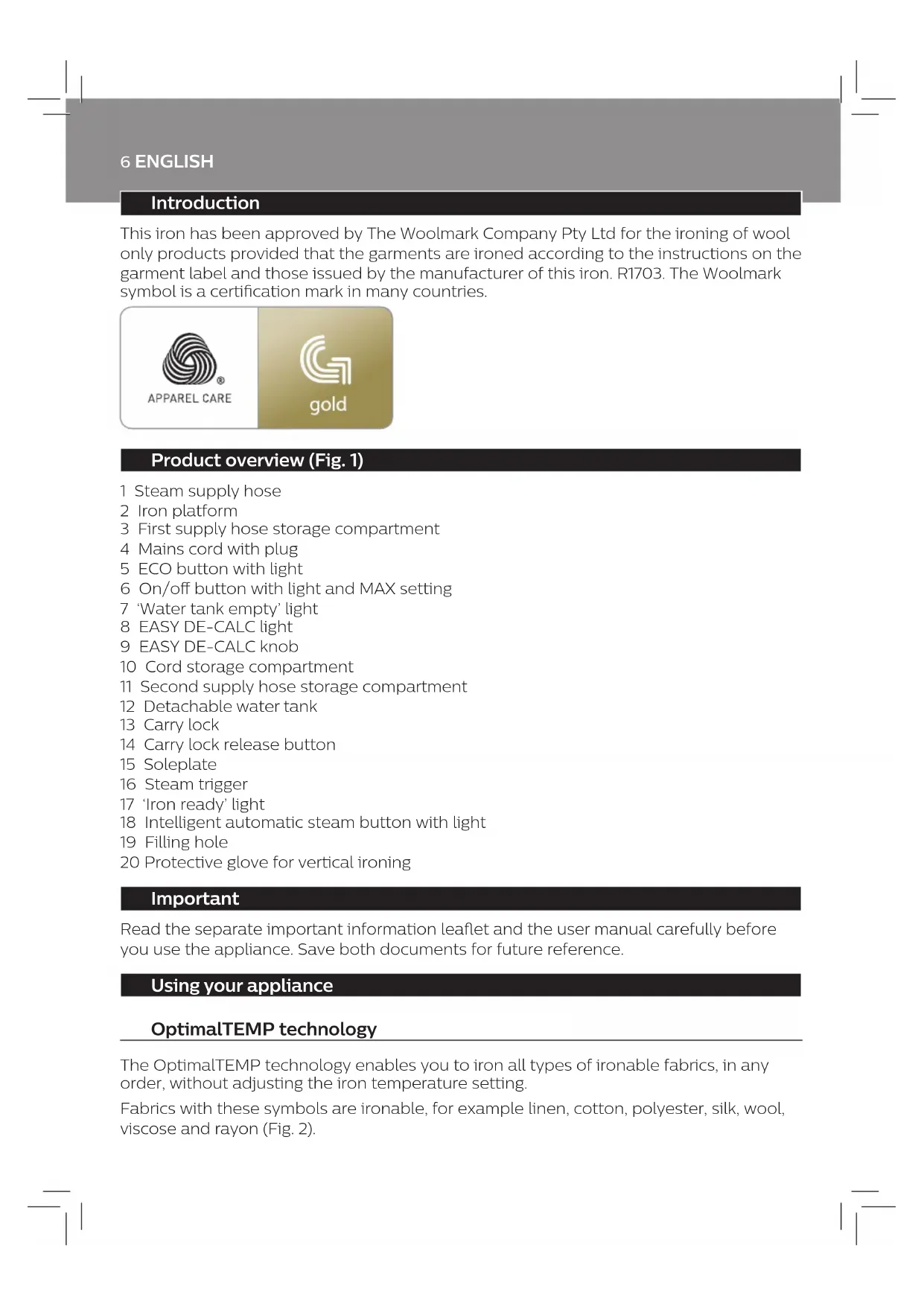 71 6 ENGLISH Introduction This iron has been approved by The Woolmark Company Pty Ltd for the ironing of wool only products provided that the garments are ironed according to the instructions on the garment label and those issued by the manufacturer of this iron. R1703. The Woolmark symbol is a certication mark in many countries. Product overview (Fig. 1) 1 Steam supply hose 2 Iron platform 3 First supply hose storage compartment 4 Mains cord with plug 5 ECO button with light 6 On/o button with light and MAX setting 7 ‘Water tank empty’ light 8 EASY DE-CALC light 9 EASY DE-CALC knob 10 Cord storage compartment 11 Second supply hose storage compartment 12 Detachable water tank 13 Carry lock 14 Carry lock release button 15 Soleplate 16 Steam trigger 17 ‘Iron ready’ light 18 Intelligent automatic steam button with light 19 Filling hole 20 Protective glove for vertical ironing Important Read the separate important information leaet and the user manual carefully before you use the appliance. Save both documents for future reference. Using your appliance OptimalTEMP technology The OptimalTEMP technology enables you to iron all types of ironable fabrics, in any order, without adjusting the iron temperature setting. Fabrics with these symbols are ironable, for example linen, cotton, polyester, silk, wool, viscose and rayon (Fig. 2).7 ENGLISH Fabrics with this symbol are not ironable. These fabrics include synthetic fabrics such as Spandex or elastane, Spandex-mixed fabrics and polyolens (e.g. polypropylene), but also prints on garments (Fig. 3). During ironing, you can place the iron either on the iron platform or horizontally on the ironing board. Thanks to the OptimalTEMP technology, the soleplate will not damage the ironing board cover (Fig. 4). Ironing Read this user manual, the important information leaet, and the quick start guide carefully before you use the appliance. Save them for future reference. 1 Press and hold the steam trigger to start ironing (Fig. 5). Never direct steam at people. Note: For best result on tough fabrics such as cotton, linen and jeans, keep the steam trigger pressed continuously when you move the iron over the fabric. Then move the iron over the same area a few more times without steam to dry the fabric. Note: For the best results on silk and shiny synthetic fabrics, it is recommended to keep the steam trigger pressed continuously while ironing. sensor and intelligent automatic steam mode The intelligent sensor inside your iron knows exactly when and how your iron is moving. When you activate intelligent automatic steam mode, the sensor will start recognizing the movements of your iron and will enable your iron to release the right amount of steam automatically without you having to press the steam trigger. This will help you to get great results faster and easier. - To activate the intelligent automatic steam mode, press the intelligent automatic steam button on top of the iron handle. The intelligent automatic steam light turns on (Fig. 6). - The ‘iron ready’ light moves back and forth when the iron is moving. Note: in intelligent automatic steam mode, steam comes out automatically when you move the iron and stops when you stop moving the iron (Fig. 7). You can still press the steam trigger in this mode to activate the steam when the iron is not moving. - You can use the intelligent automatic steam mode in all steam settings, including ECO and MAX. Note: for your safety, in intelligent automatic steam mode, the steam stops when the soleplate is tilted. - To exit the intelligent automatic steam mode, press the intelligent automatic steam button. The intelligent automatic steam light turns o. You need to press the steam trigger to continue your ironing.8 ENGLISH Steam boost function The steam boost function is designed to help tackle dicult creases. - Press the steam trigger twice quickly to activate the steam boost function. The appliance releases powerful shots of steam continuously (Fig. 8). - To stop the steam boost function, press the steam trigger once. Vertical ironing Hot steam is emitted from the iron. Never attempt to remove creases from a garment that someone is wearing. Do not apply steam near your or someone else’s hand. You can use the iron in vertical position to remove wrinkles from hanging fabrics. 1 Put on the glove. 2 Hold the iron in vertical position, press the steam trigger and touch the garment slightly with the soleplate (Fig. 9). Note: for your safety, the intelligent automatic steam mode is not available for vertical ironing. ECO setting By using the ECO setting (reduced amount of steam), you can save energy without compromising on the ironing result. - Press the ECO button. The green ECO light turns on (Fig. 10). - To deactivate ECO setting, press then ECO button again. The green ECO light goes o. MAX setting For faster ironing and a higher amount of steam, you can use MAX setting. 1 Press and hold the on/o button for 2 seconds until the light turns white (Fig. 11). 2 To deactivate MAX setting, press and hold the on/o button again for 2 seconds until the white light turns blue. Auto shut-o - The appliances enters the standby mode if it has not been used for 10 minutes. The light in the on/ o button starts to ash (Fig. 12). - To activate the appliance again, press the on/o button. The appliance starts to heat up again. - The appliance switches o automatically if it has not been used for another 10 minutes after it enters the standby mode. The light in the on/o button goes o.9 ENGLISH