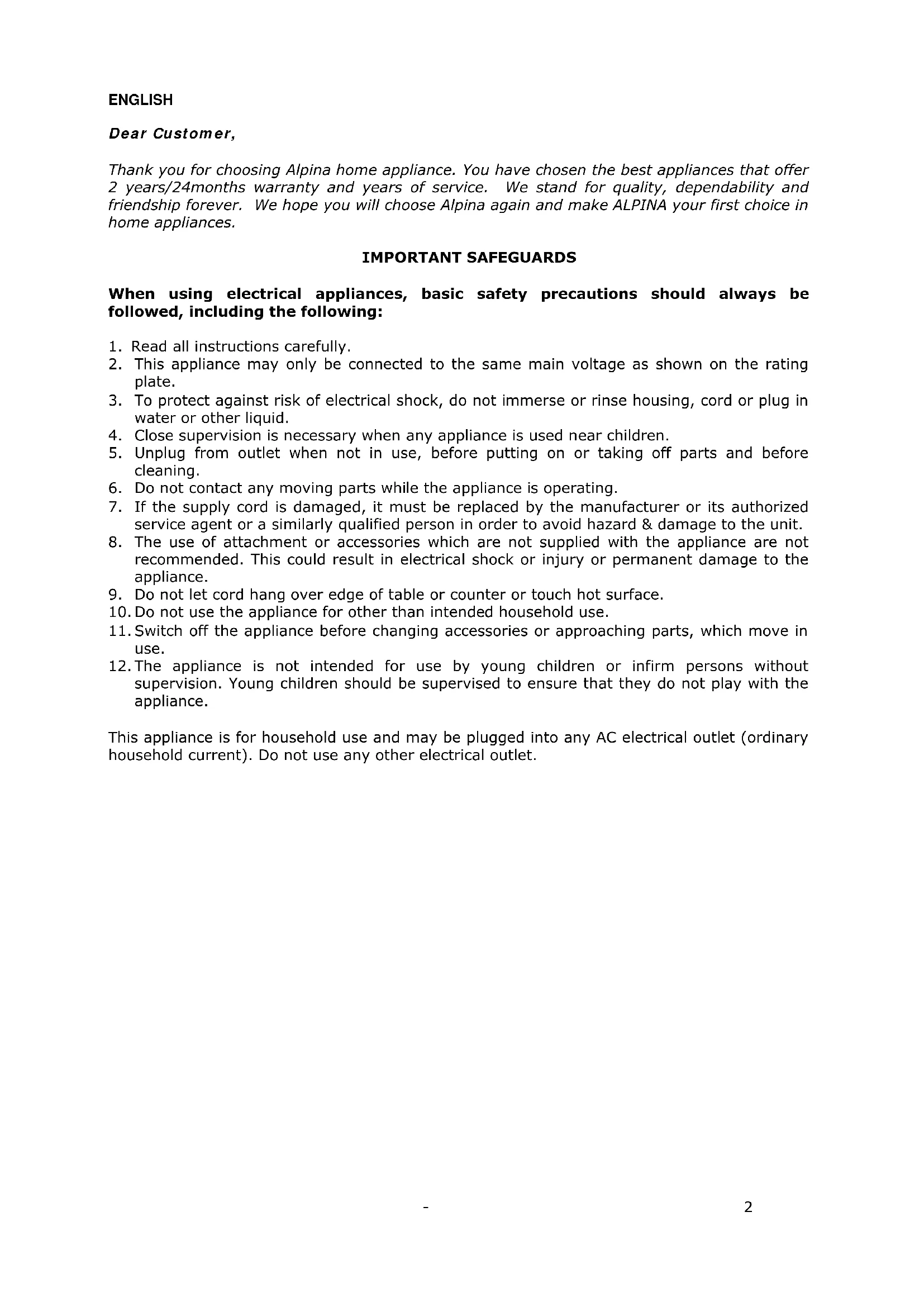 Thank you for choosing Alpina home appliance. You have chosen the best appliances that offer 2 years/24 months warranty and years of service. We stand for quality, dependability and friendship forever. We hope you will choose Alpina again and make ALPINA your first choice in home appliances.