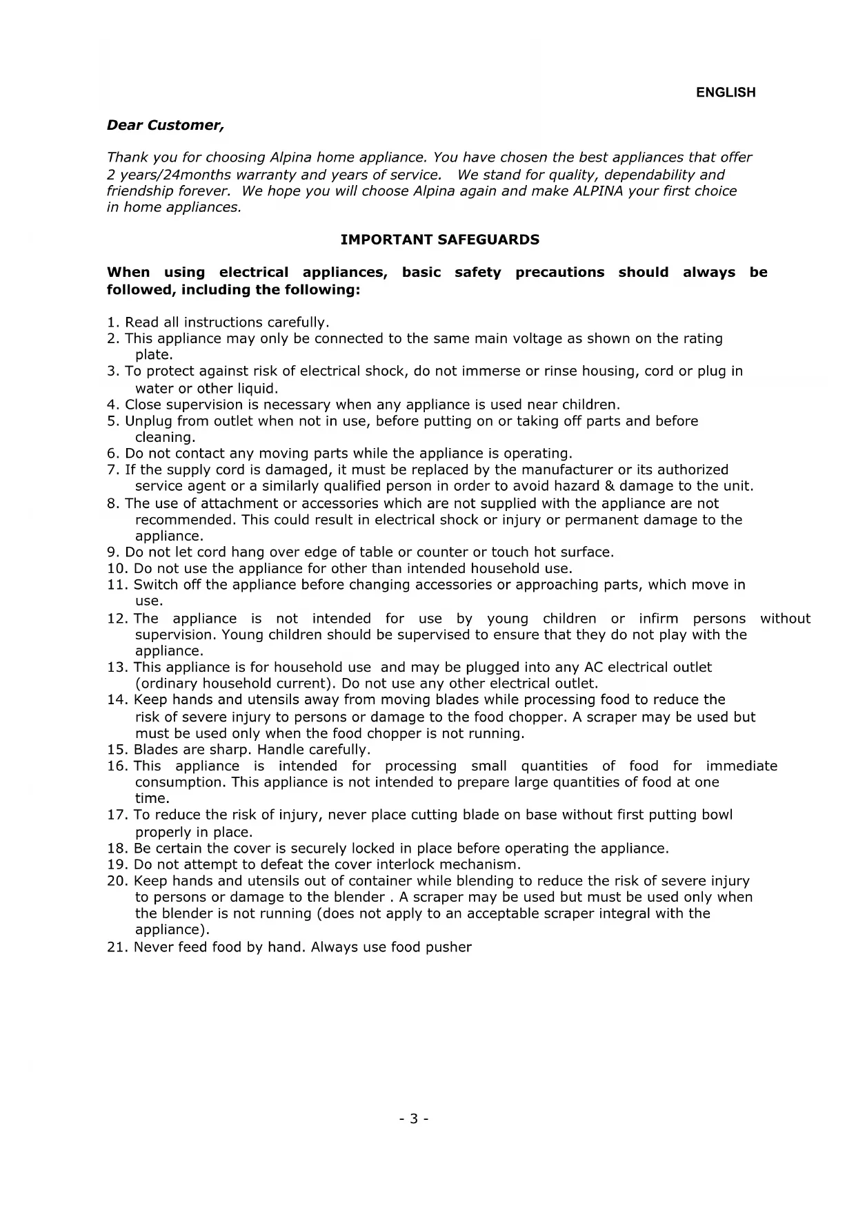 - 2 -ENGLISH Dear Customer, Thank you for choosing Alpina home appliance. You have chosen the best appliances that offer 2 years/24months warranty and years of service. We stand for quality, dependability and friendship forever. We hope you will choose Alpina again and make ALPINA your first choice in home appliances. IMPORTANT SAFEGUARDS When using electrical appliances, basic safety precautions should always be followed, including the following:
