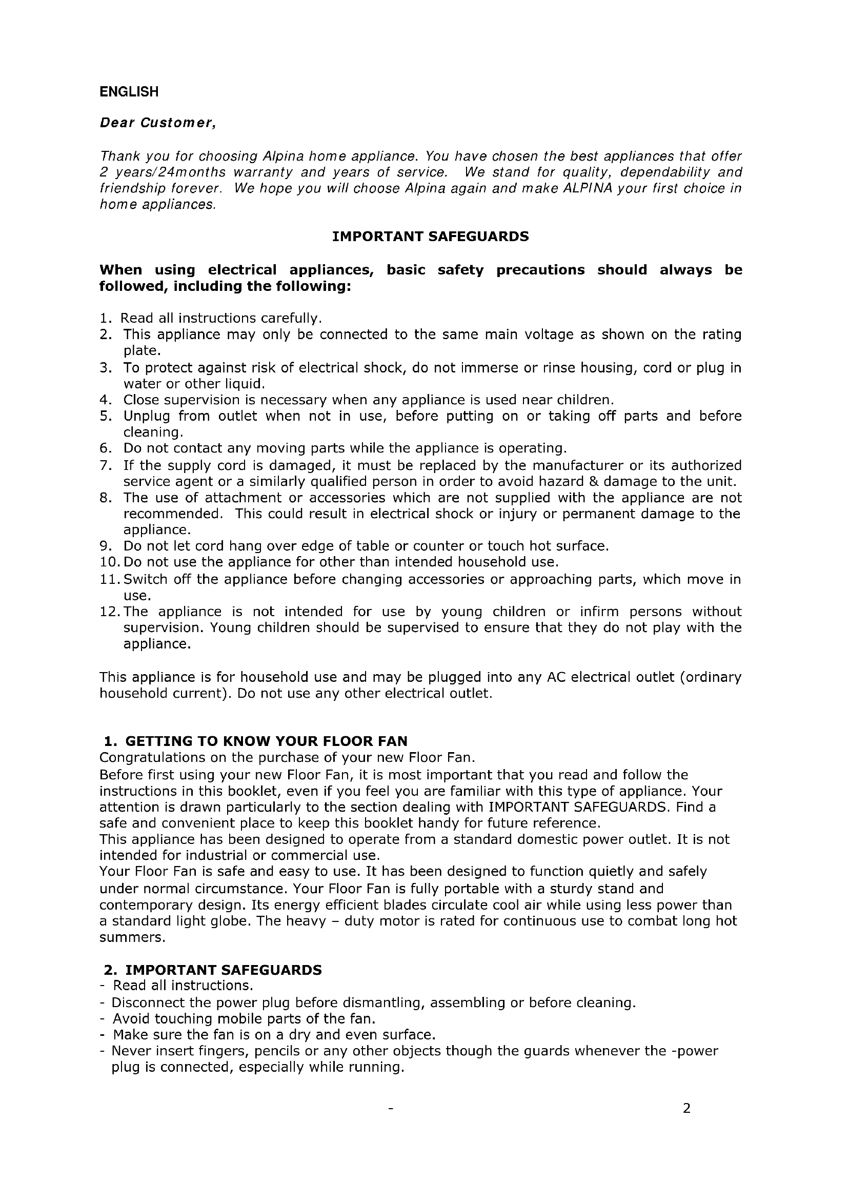 Before first using your new Floor Fan, it is most important that you read and follow the instructions in this booklet, even if you feel you are familiar with this type of appliance. Your attention is drawn particularly to the section dealing with IMPORTANT SAFEGUARDS. Find a safe and convenient place to keep this booklet handy for future reference.