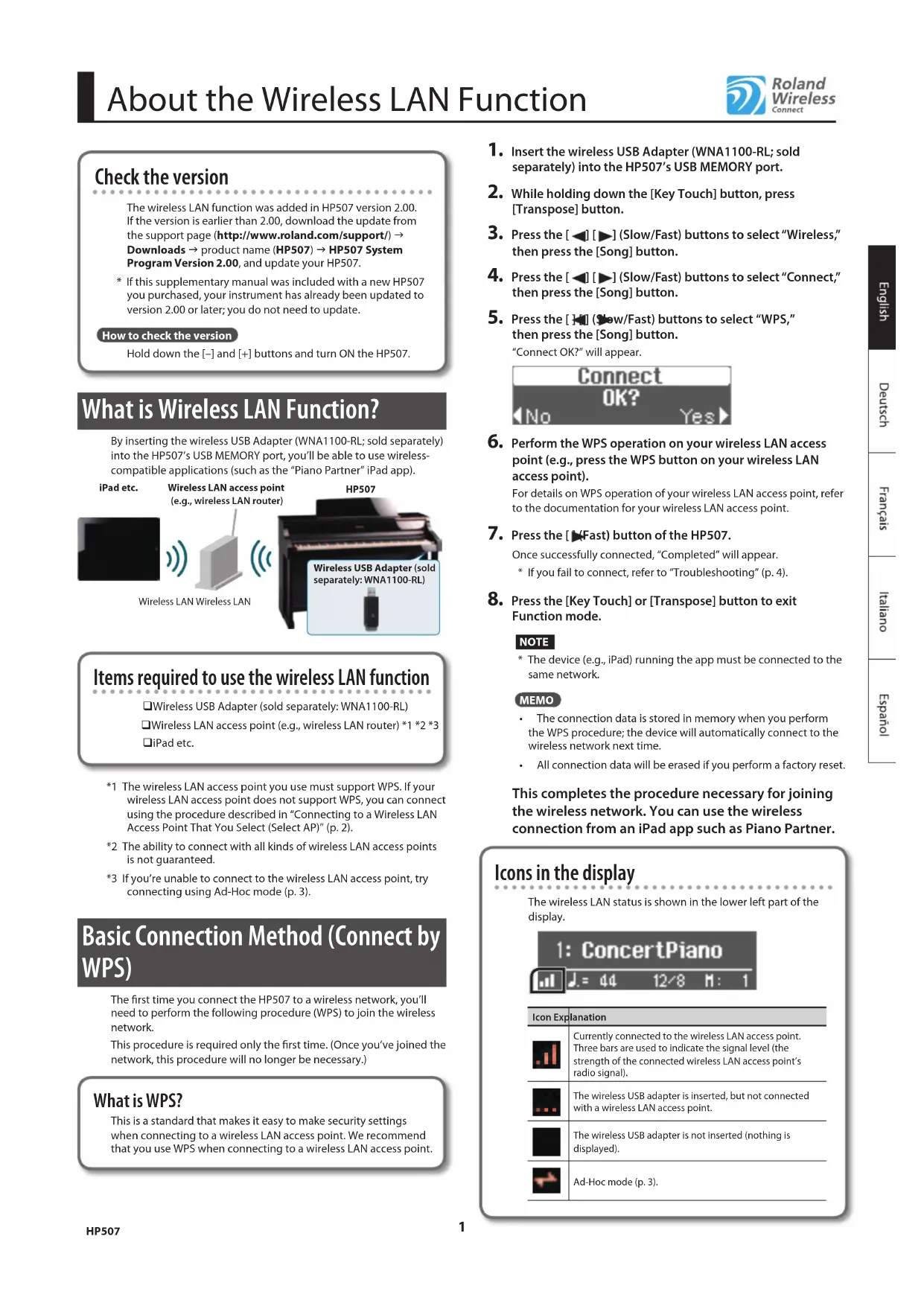 About the Wireless LAN Function Check the version The wireless LAN function was added in HP507 version 2.00. If the version is earlier than 2.00, download the update from the support page (http://www.roland.com/support/) g Downloads g product name (HP507) g HP507 System Program Version 2.00, and update your HP507.* If this supplementary manual was included with a new HP507 you purchased, your instrument has already been updated to version 2.00 or later; you do not need to update.How to check the versionHold down the [–] and [+] buttons and turn ON the HP507. What is Wireless LAN Function? By inserting the wireless USB Adapter (WNA1100-RL; sold separately) into the HP507’s USB MEMORY port, you’ll be able to use wireless-compatible applications (such as the “Piano Partner” iPad app).HP507Wireless USB Adapter (sold separately: WNA1100-RL)Wireless LAN access point (e.g., wireless LAN router)Wireless LAN Wireless LANiPad etc. Items required to use the wireless LAN function Wireless USB Adapter (sold separately: WNA1100-RL) Wireless LAN access point (e.g., wireless LAN router) *1 *2 *3 iPad etc.*1 The wireless LAN access point you use must support WPS. If your wireless LAN access point does not support WPS, you can connect using the procedure described in “Connecting to a Wireless LAN Access Point That You Select (Select AP)” (p. 2).*2 The ability to connect with all kinds of wireless LAN access points is not guaranteed.*3 If you’re unable to connect to the wireless LAN access point, try connecting using Ad-Hoc mode (p. 3). Basic Connection Method (Connect by WPS) The rst time you connect the HP507 to a wireless network, you’ll need to perform the following procedure (WPS) to join the wireless network. This procedure is required only the rst time. (Once you’ve joined the network, this procedure will no longer be necessary.) What is WPS? This is a standard that makes it easy to make security settings when connecting to a wireless LAN access point. We recommend that you use WPS when connecting to a wireless LAN access point.