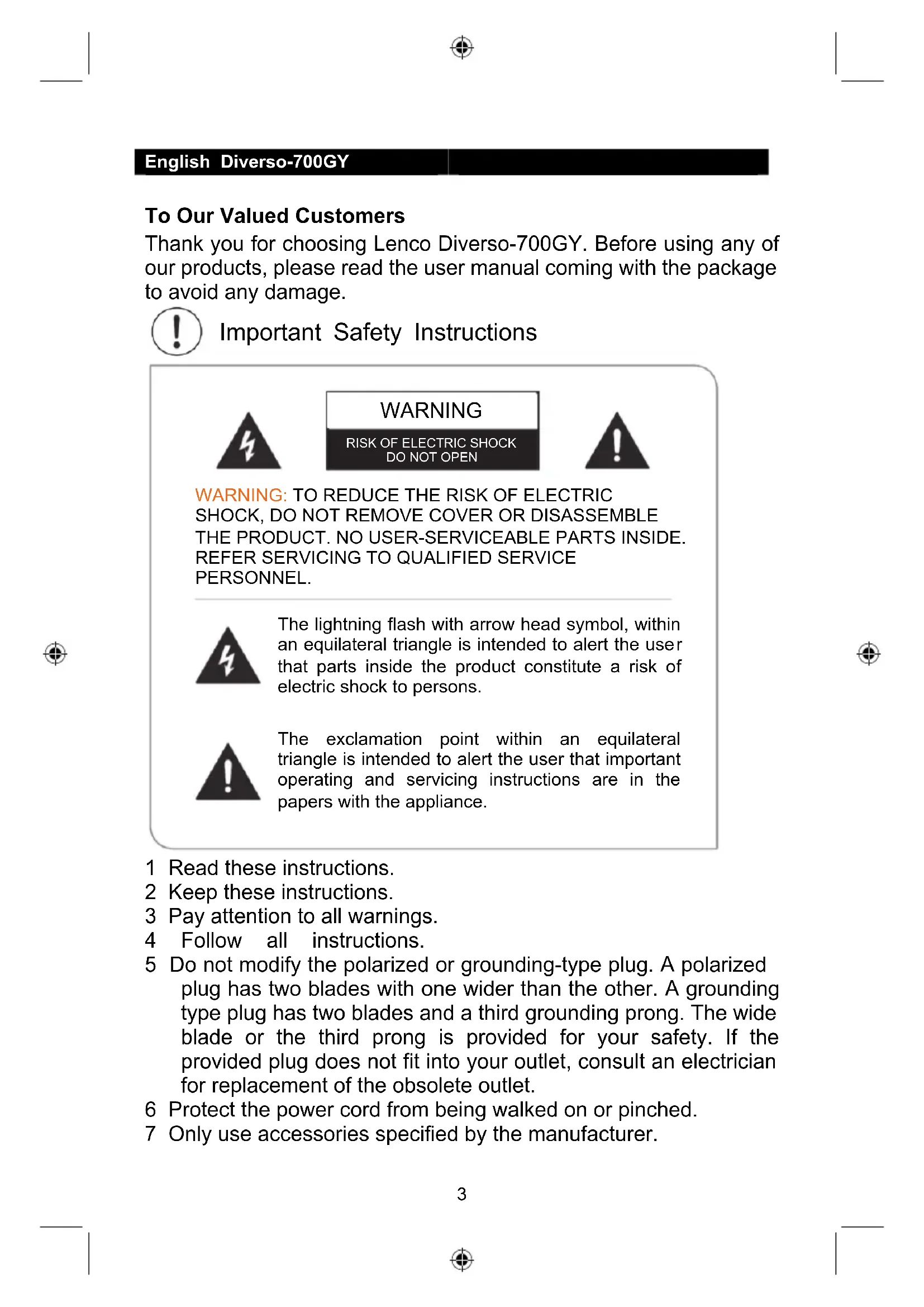 - Español English Diverso-700GY To Our Valued Customers Thank you for choosing Lenco Diverso-700GY. Before using any of our products, please read the user manual coming with the package to avoid any damage. Important Safety Instructions 1 Read these instructions. 2 Keep these instructions. 3 Pay attention to all warnings. 4 Follow all instructions. 5 Do not modify the polarized or grounding-type plug. A polarized plug has two blades with one wider than the other. A grounding type plug has two blades and a third grounding prong. The wide blade or the third prong is provided for your safety. If the provided plug does not fit into your outlet, consult an electrician for replacement of the obsolete outlet. 6 Protect the power cord from being walked on or pinched. 7 Only use accessories specified by the manufacturer. WARNING p. 723