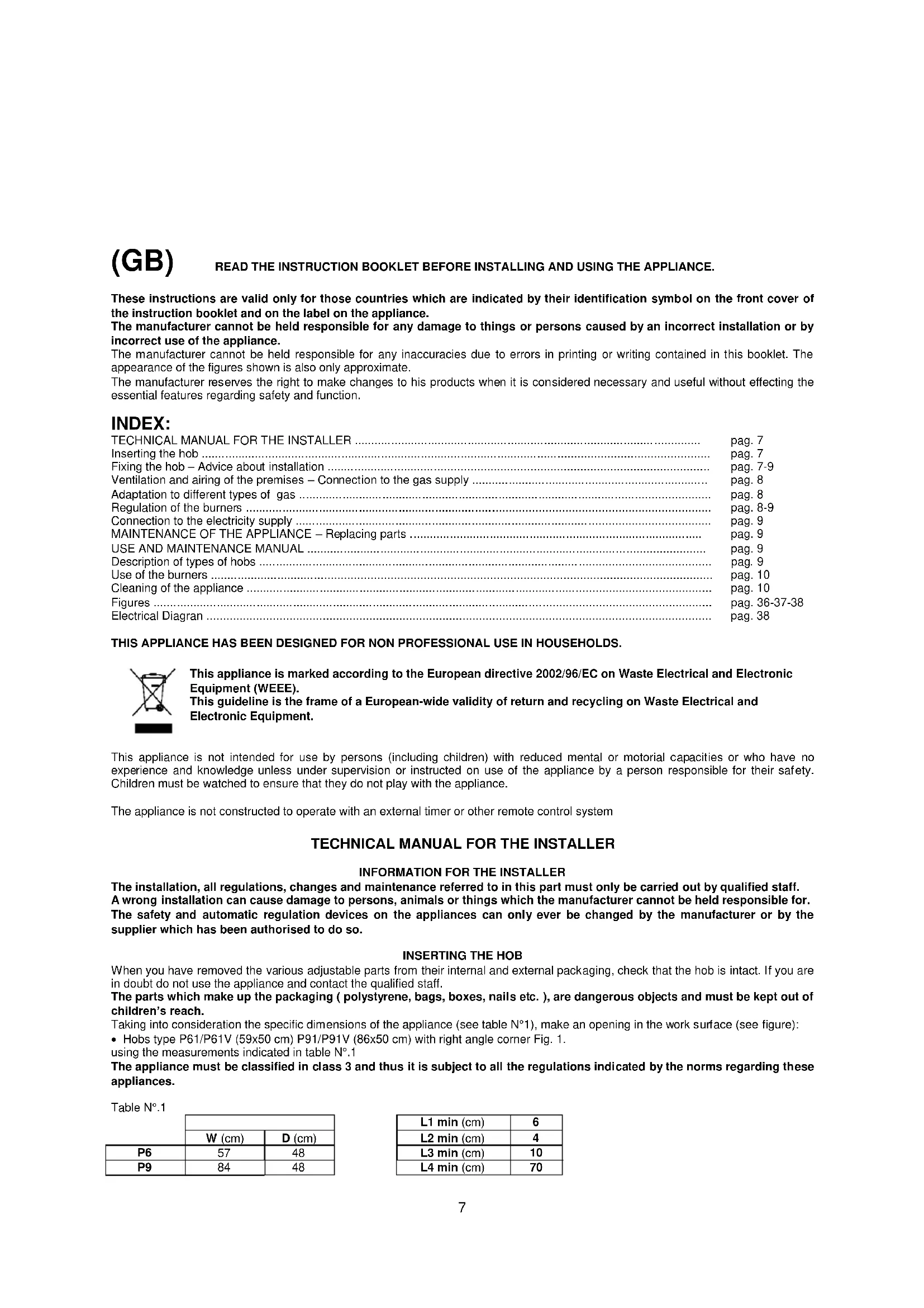 | Fixing the hob – Advice about installation | pag. 7-9 |