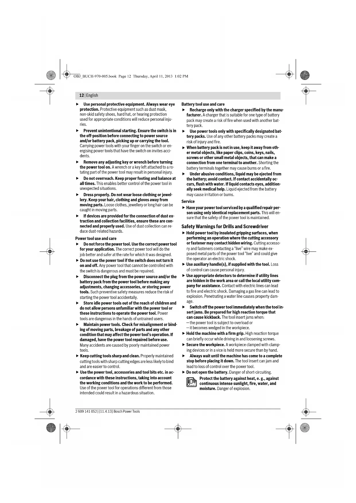 When battery pack is not in use, keep it away from oth- er metal objects, like paper clips, coins, keys, nails, screws or other small metal objects, that can make a connection from one terminal to another. Shorting the battery terminals together may cause burns or a fire. Under abusive conditions, liquid may be ejected from the battery; avoid contact. If contact accidentally oc- curs, flush with water. If liquid contacts eyes, addition- ally seek medical help. Liquid ejected from the battery may cause irritation or burns. Service Have your power tool serviced by a qualified repair per- son using only identical replacement parts. This will en- sure that the safety of the power tool is maintained. Safety Warnings for Drills and Screwdriver Hold power tool by insulated gripping surfaces, when performing an operation where the cutting accessory or fastener may contact hidden wiring. Cutting accesso- ry and fasteners contacting a “live” wire may make ex- posed metal parts of the power tool “live” and could give the operator an electric shock. Use auxiliary handle(s), if supplied with the tool. Loss of control can cause personal injury. Use appropriate detectors to determine if utility lines are hidden in the work area or call the local utility com- pany for assistance. Contact with electric lines can lead to fire and electric shock. Damaging a gas line can lead to explosion. Penetrating a water line causes property dam- age. Switch off the power tool immediately when the tool in- sert jams. Be prepared for high reaction torque that can cause kickback. The tool insert jams when: — the power tool is subject to overload or — it becomes wedged in the workpiece. Hold the machine with a firm grip. High reaction torque can briefly occur while driving in and loosening screws. Secure the workpiece. A workpiece clamped with clamp- ing devices or in a vice is held more secure than by hand. Always wait until the machine has come to a complete stop before placing it down. The tool insert can jam and lead to loss of control over the power tool. Do not open the battery. Danger of short-circuiting. Protect the battery against heat, e. g., against continuous intense sunlight, fire, water, and moisture. Danger of explosion. OBJ_BUCH-970-005.book Page 12 Thursday, April 11, 2013 1:02 PMEnglish | 13 Bosch Power Tools 2 609 141 052 | (11.4.13) In case of damage and improper use of the battery, va- pours may be emitted. Ventilate the area and seek medical help in case of complaints. The vapours can irri- tate the respiratory system. Use the battery only in conjunction with your Bosch power tool. This measure alone protects the battery against dangerous overload. Use only original Bosch batteries with the voltage list- ed on the nameplate of your power tool. When using oth- er batteries, e.g. imitations, reconditioned batteries or other brands, there is danger of injury as well as property damage through exploding batteries. Product Description and Specifica- tions Read all safety warnings and all instruc- tions. Failure to follow the warnings and in- structions may result in electric shock, fire and/or serious injury. While reading the operating instructions, unfold the graphics page for the machine and leave it open. Intended Use The machine is intended for driving in and loosening screws as well as for drilling in wood, metal, ceramic and plastic. The light of this power tool is intended to illuminate the power tool’s direct area of working operation and is not suitable for household room illumination Product Features The numbering of the product features refers to the illustra- tion of the machine on the graphics page. 1 Keyless chuck 2 Torque presetting ring 3 Gear selector 4 Battery unlocking button* 5 Battery pack* 6 Rotational direction switch 7 On/Off switch 8 Battery charge-control indicator 9 “PowerLight” 10 Handle (insulated gripping surface) 11 Universal bit holder* 12 Screwdriver bit* *Accessories shown or described are not part of the standard de- livery scope of the product. A complete overview of accessories can be found in our accessories program. Technical Data Noise/Vibration Information Measured sound values determined according to EN 60745. Typically the A-weighted sound pressure level of the product is 71 dB(A). Uncertainty K=3 dB. The noise level when working can exceed 80 dB(A). Wear hearing protection! Vibration total values a