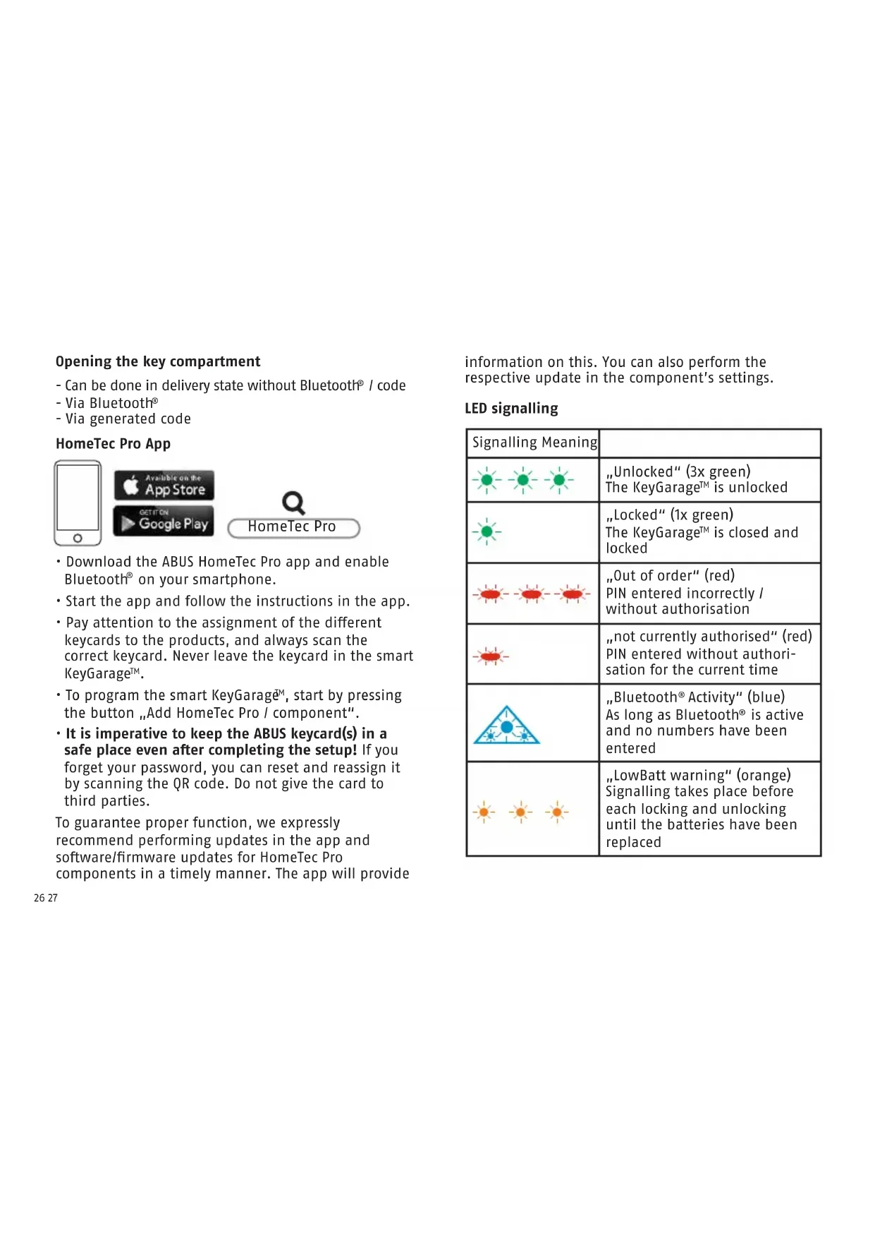 - Via generated code information on this. You can also perform the respective update in the component’s settings. LED signalling Signalling Meaning „Unlocked“ (3x green) The KeyGarage