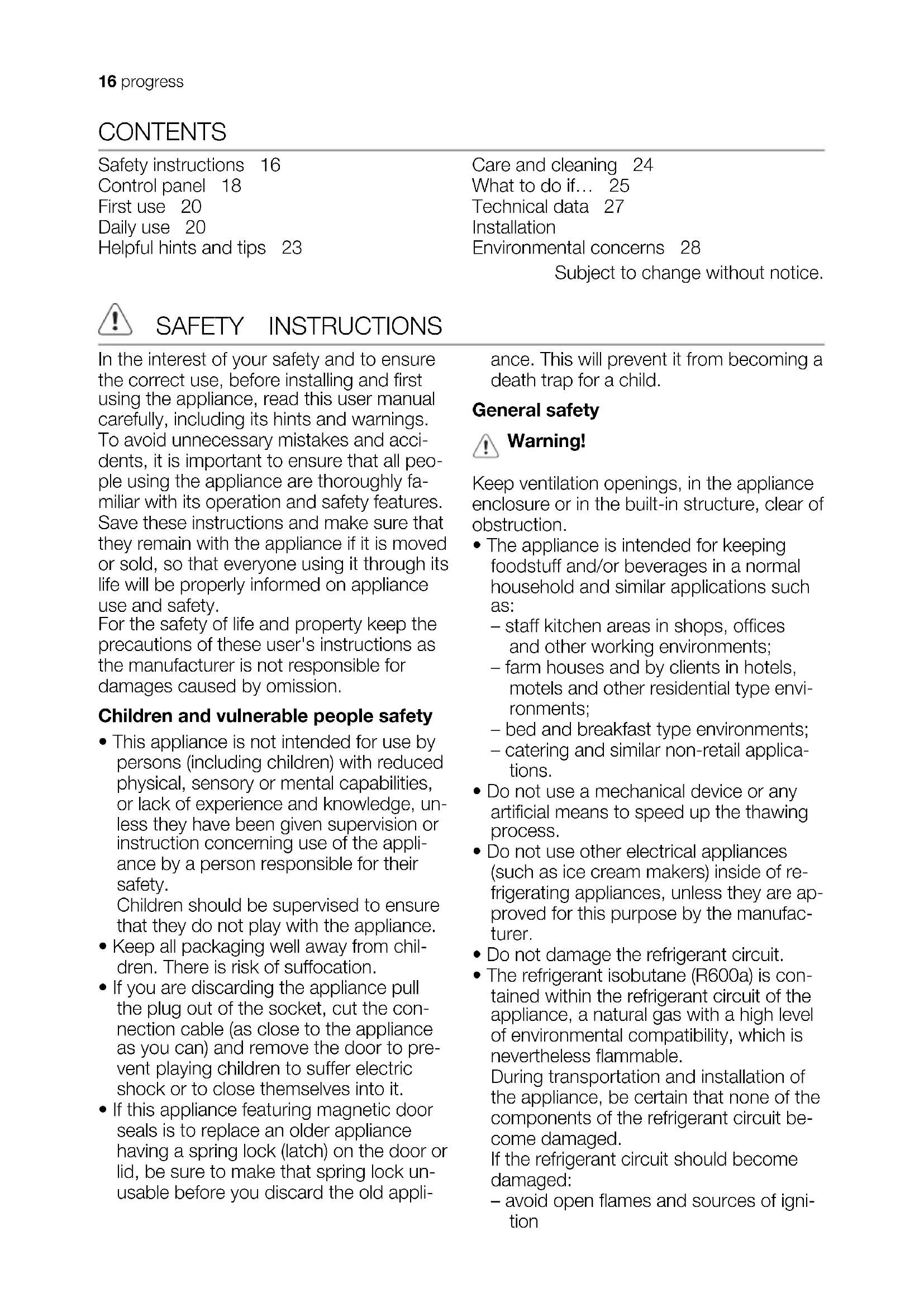 - The refrigerant isobutane (R600a) is con- tained within the refrigerant circuit of the appliance, a natural gas with a high level of environmental compatibility, which is nevertheless flammable. During transportation and installation of the appliance, be certain that none of the components of the refrigerant circuit be- come damaged. If the refrigerant circuit should become damaged: – avoid open flames and sources of igni- tion 16 progress– thoroughly ventilate the room in which the appliance is situated