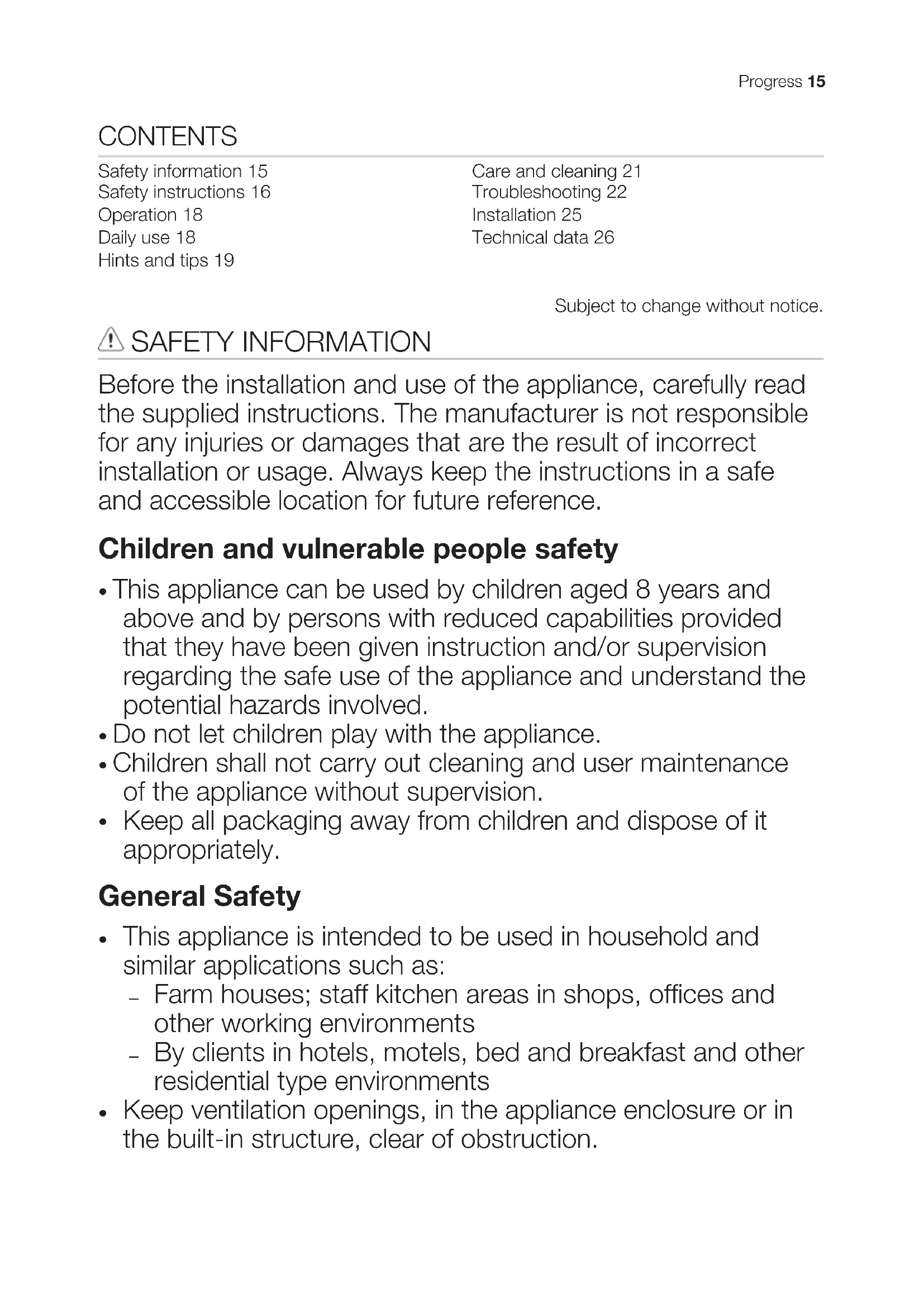 Keep ventilation openings, in the appliance enclosure or in the built-in structure, clear of obstruction. Progress 15• Do not use mechanical devices or other means to accelerate the defrosting process, other than those recommended by the manufacturer.