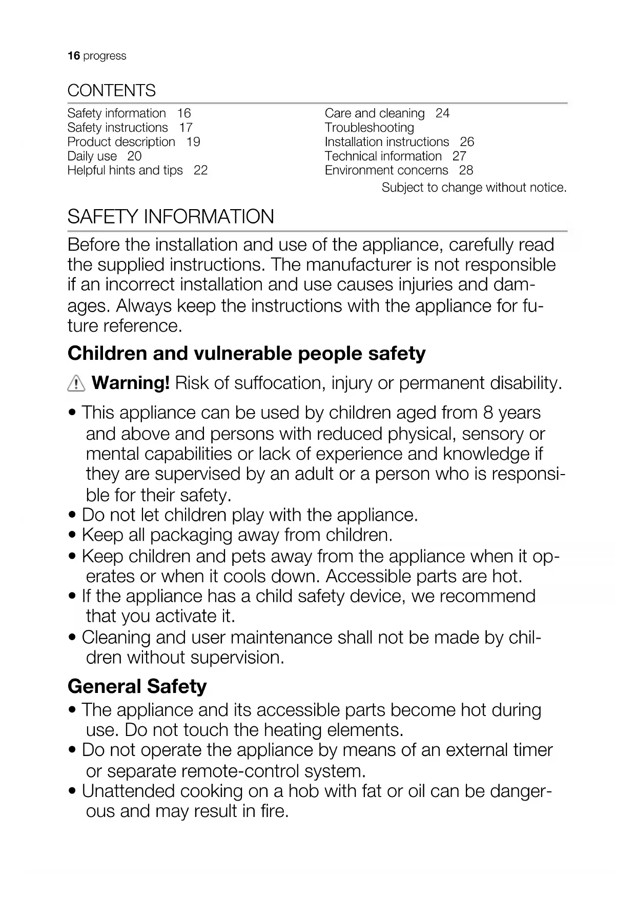 - Unattended cooking on a hob with fat or oil can be danger- ous and may result in fire. 16 progress• Never try to extinguish a fire with water, but switch off the appliance and then cover flame e.g. with a lid or a fire blan- ket.