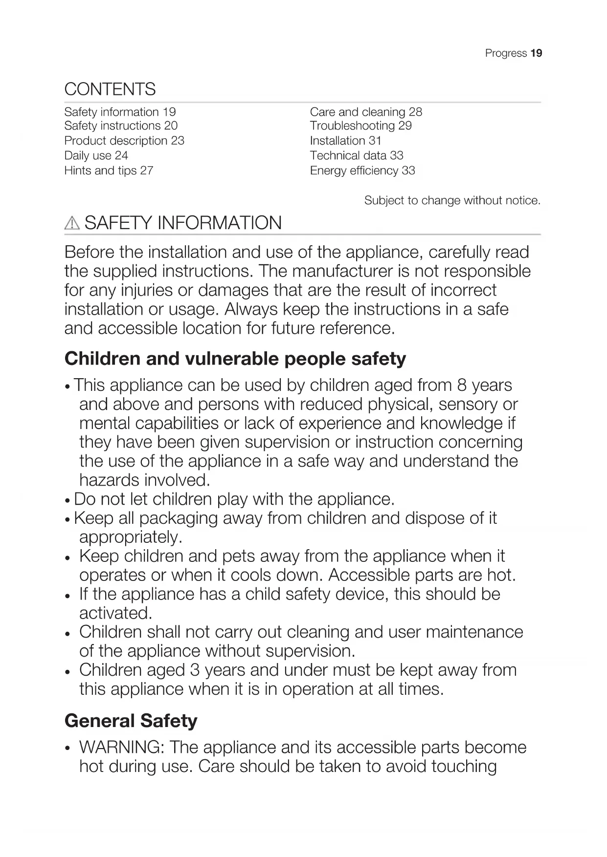 - Make sure that the ventilation openings are not blocked. Progress 21• Do not let the appliance stay unattended during operation.