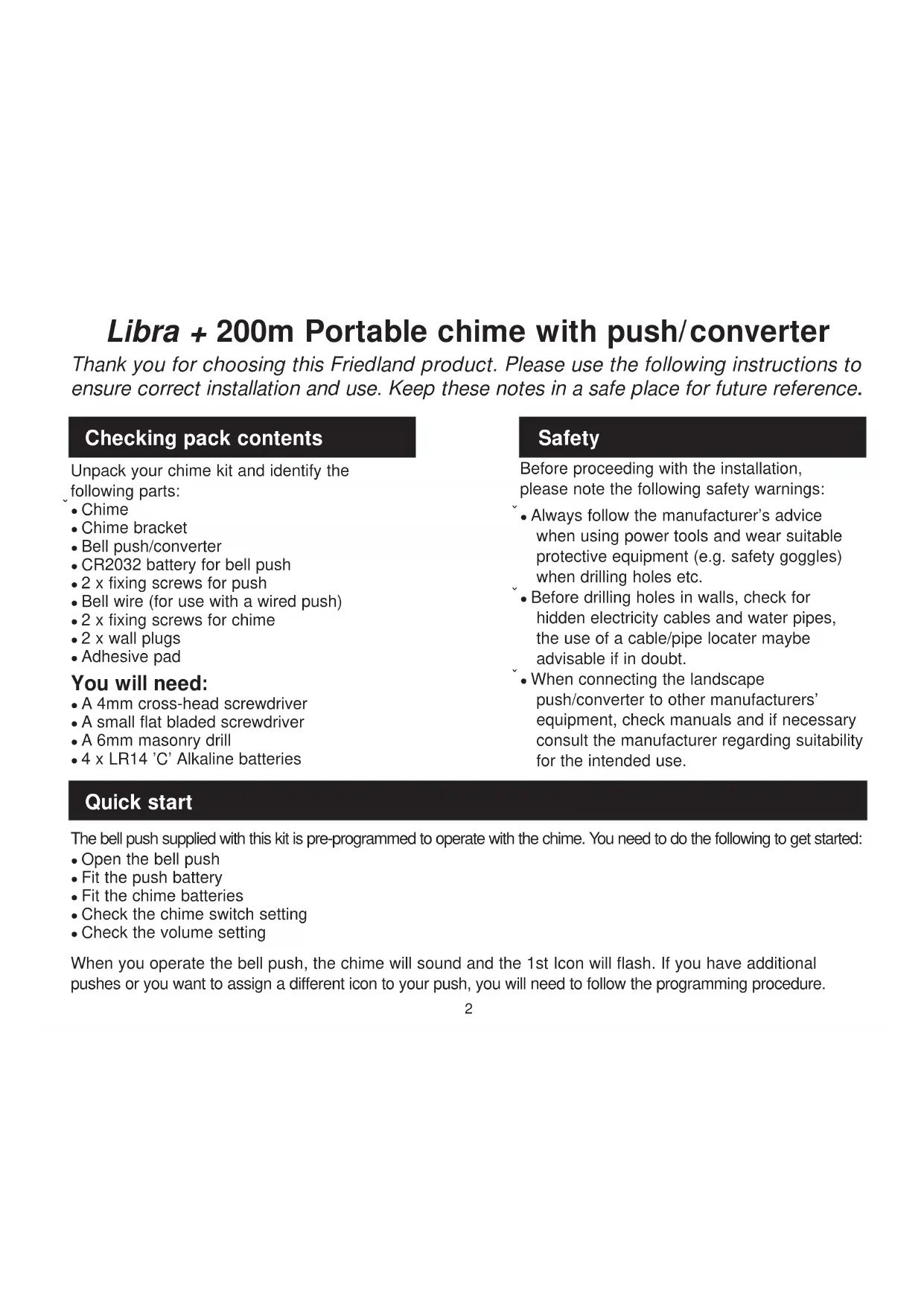 Typical connections9 A ‘beep’ sound is heard in learn mode… ¬● The push you are programming has already been learnt by the chime. ¬● If you want to change the icon associated with the push, use the un-learn procedure, then programme the push again. Two ‘beep’ sounds are heard after the normal chime sound… ¬● This indicates a low battery in the bell push that activated the chime. Fit a new battery, type CR2032. When the bell push is operated, the amber confidence light does not turn on, or is only on for a short time… ¬● In normal operation, the amber light will turn on for 1 second. When the battery is weak, the light will only turn on for a short time. Fit a new battery, type CR2032. The chime does not work… ● Check that the batteries are the correct type, LR14 ‘C’ cells. Only use alkaline batteries. ● Check that the batteries are fitted correctly. ● The chime could be out of range of the bell push. Try the chime in a different location. ● The chime might not have learnt the identity of the bell push. Follow the programming procedure. The chime does not sound… ● Check the chime switch position. ● Check that the volume control is not at the minimum setting. The flashing light does not work… ● Check the chime switch position. Range is reduced… ● Metal structures, including uPVC door frames can reduce the range of the product. Avoid mounting the push or chime on or near metal structures. ● Other equipment can cause radio interference that affects your chime. ● Walls and ceilings will reduce the range. ● Weak batteries will reduce range. Replace every 12 –18 months. In cold conditions (below 5ºC), batteries may need to be replaced more often. Troubleshooting10 Amber light flashes… ● When the chime battery is low, an amber light will flash every 5 seconds. Fit new batteries in the chime, type LR14 ‘C’ cells. Only use alkaline batteries. When the push converter function is used, the chime does not operate... ● Ensure that the wiring to the push is correct. ● Check that the correct terminals have been used and that screws are tightened. Chime/Push does not work with my older Libra equipment… ● Libra + is not compatible with the earlier Libra system. ● Only use accessories marked Libra +. Troubleshooting cont....11 Friedland, The Arnold Centre, Paycocke Road, Basildon, Essex, SS14 3EA www.friedland.co.uk Friedland guarantees this product for 2 years from the date of purchase. Proof of purchase is required; this does not affect your statutory rights. If you require further information about our product, call the Friedland helpline on