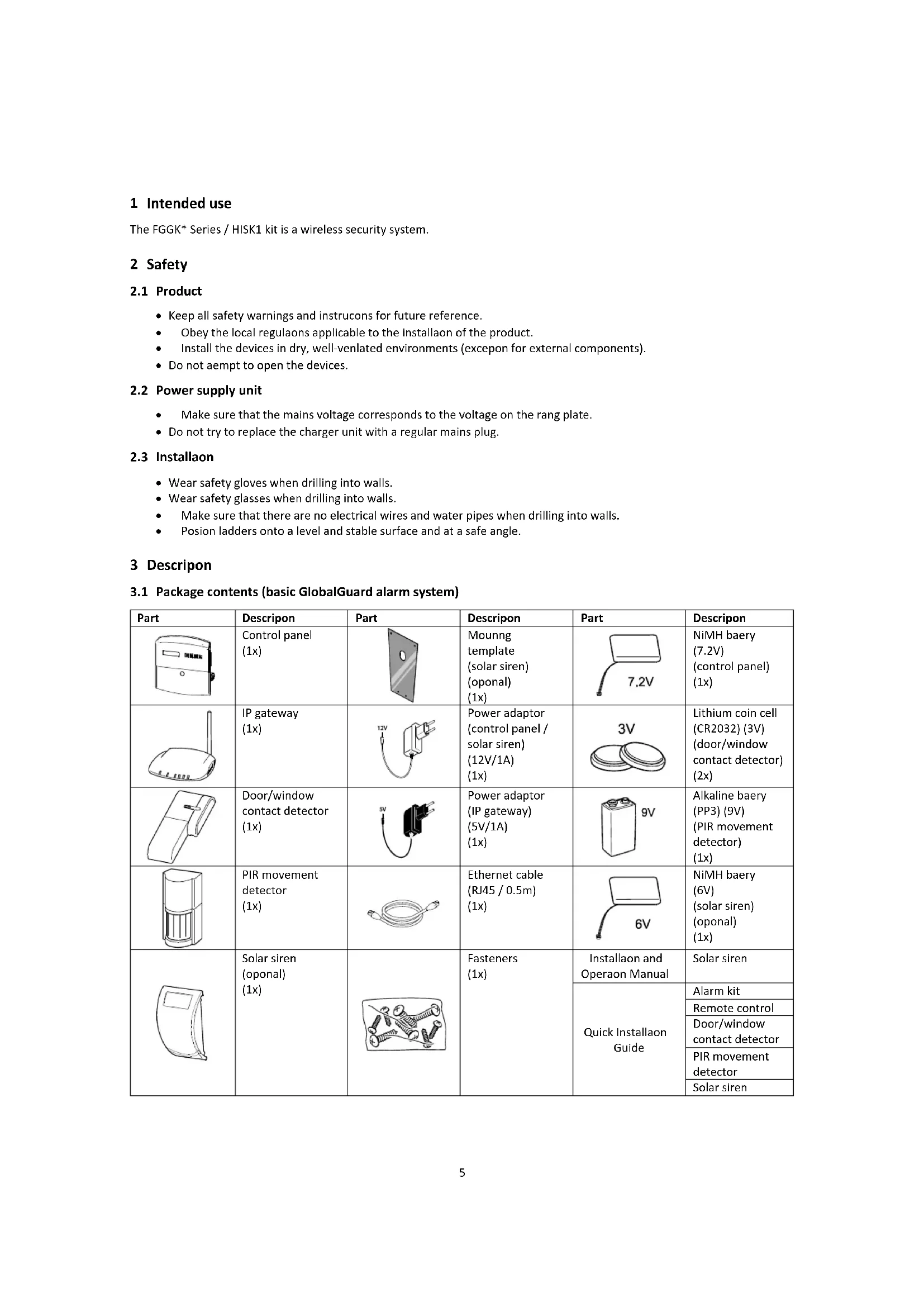 solvent-based or aerosol cleaners. Do not clean the inside of the siren or allow water to enter the siren to make sure that the solar panel keeps receiving all the available light. 2. Do not leave the siren for long periods with the batteries connected, unless the siren is able to receive sufficient light to maintain the battery charge. If the battery charge is not maintained, the rechargeable main battery will run unacceptably low and the siren must be recharged from the 12Vdc/1A power supply of the control panel. Install a new initial power-up battery to make sure that the siren receives sufficient power until the solar panel can recharge the main battery. 3. Do not leave the rechargeable main battery in a discharged state for long periods. The rechargeable main battery has a typical life of 3-4 years and does not require any maintenance. Replacement batteries: 7.2V NiMH battery (1x) / 9V PP3 alkaline battery (1x)29 9 Troubleshooting Problem Solution The first two indicators on the IP gateway remain orange and do not stabilise to green. Make sure that the Internet connection is active and not restricted. Make sure that the control panel is on. Make sure that the IP gateway is within operating range of the control panel. The RF indicator on the IP gateway will remain orange if the IP gateway is not within operating range of the control panel. The control panel does not work. The power indicator is off or flashes. Mains power failure: Check whether other electrical circuits are operable. Make sure that the power adaptor is connected to the control panel. Make sure that the power adaptor is connected to the wall socket (and the wall socket is switched on). The event log indicator on the control panel flashes. Read the event message. Check whether the available remote controls have a low-battery condition. If necessary, replace the batteries. Check whether the available remote keypads have a low-battery condition. If necessary, replace the batteries. Check whether the available door/window contact detectors have a low-battery condition. If necessary, replace the batteries. Check whether the available PIR movement detectors have a low-battery condition. If necessary, replace the batteries. The control panel does not accept the 4-digit PIN code (User). Enter the correct 4-digit PIN code (User). Do not wait for more than 5 seconds between pressing the digit buttons. Reset to factory defaults and reprogram the system. A detection zone is triggered, but no alarm sounds. The entry/exit delay is not yet expired. The alarm time has expired and the system has reset. The alarm time has been programmed to “NO ALARM”. The siren and the indicators are operating, but no alarm sounds. Make sure that the siren is mounted to the wall correctly and the tamper switch is fully pressed. The siren does not respond to the control panel. Enter the correct 4-digit PIN code (User). Make sure that the ID code of the siren is learned by the control panel. Make sure that DIP switch 5 of the siren is set to “SIREN”. Make sure that the siren is installed within effective radio range of the control panel and away from metal objects. Make sure that the siren is set to “SERVICE MODE OFF”. The rechargeable main battery of the siren is discharged: