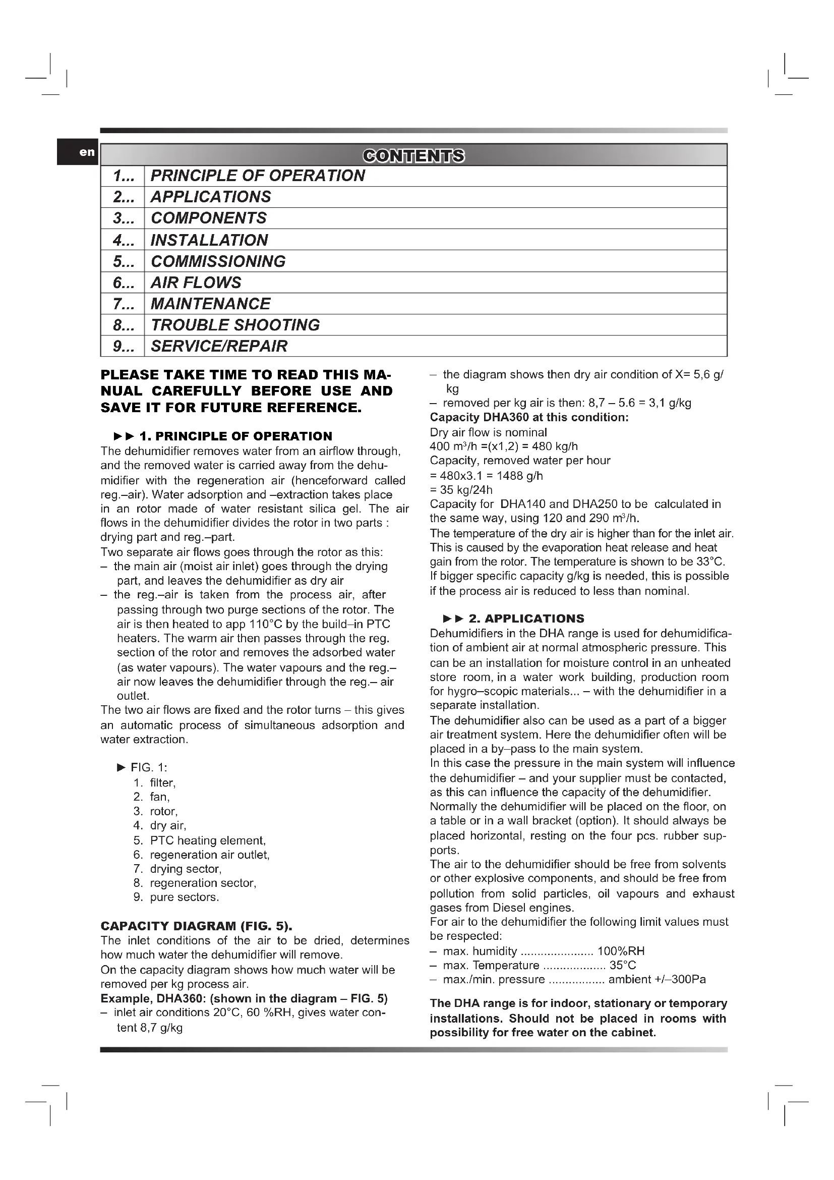 - /h. The temperature of the dry air is higher than for the inlet air. This is caused by the evaporation heat release and heat gain from the rotor. The temperature is shown to be 33°C. If bigger specic capacity g/kg is needed, this is possible if the process air is reduced to less than nominal. ► 2. APPLICATIONS Dehumidiers in the DHA range is used for dehumidica- tion of ambient air at normal atmospheric pressure. This can be an installation for moisture control in an unheated store room, in a water work building, production room for hygro–scopic materials