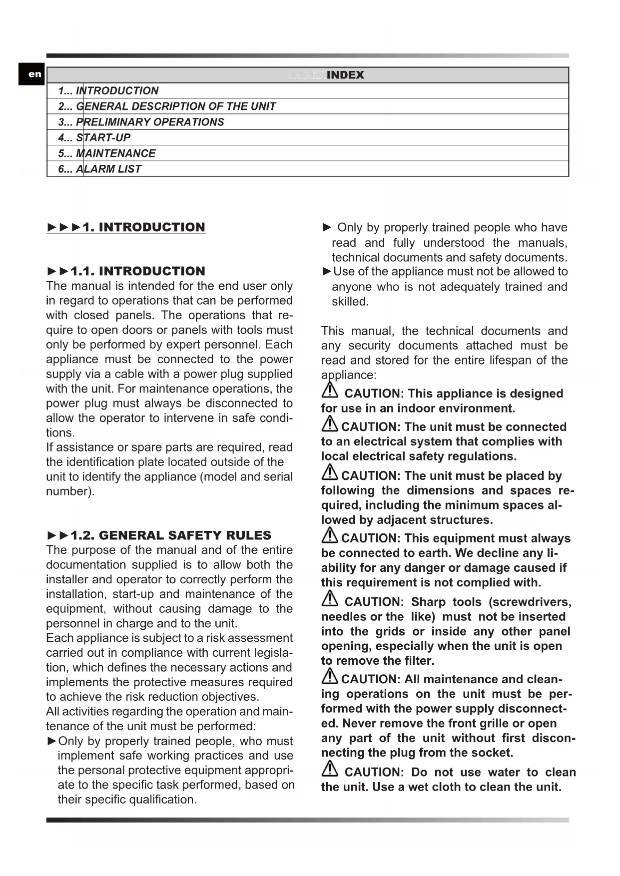 3... PRELIMINARY OPERATIONS 4... START-UP 5... MAINTENANCE 6... ALARM LIST ►►►1. INTRODUCTION ►►1.1. INTRODUCTION The manual is intended for the end user only in regard to operations that can be performed with closed panels. The operations that re- quire to open doors or panels with tools must only be performed by expert personnel. Each appliance must be connected to the power supply via a cable with a power plug supplied with the unit. For maintenance operations, the power plug must always be disconnected to allow the operator to intervene in safe condi- tions. If assistance or spare parts are required, read the identication plate located outside of the unit to identify the appliance (model and serial number).