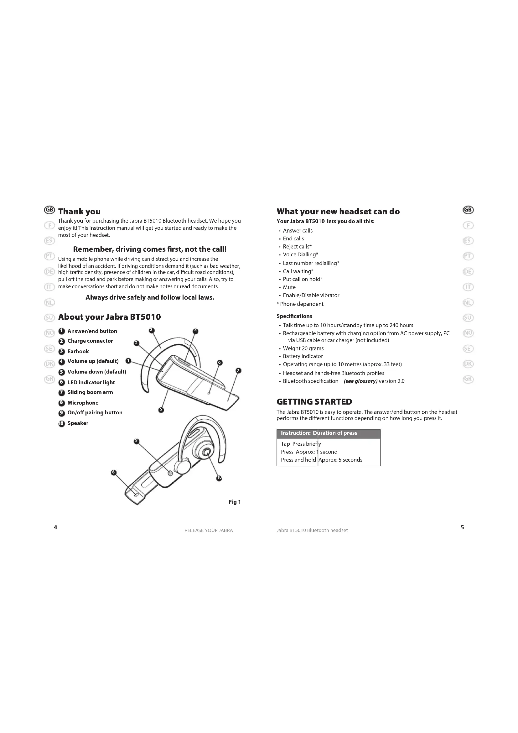 - Bluetooth specication (see glossary) version 2.0 GETTING STARTED The Jabra BT5010 is easy to operate. The answer/end button on the headset performs the dierent functions depending on how long you press it. Instruction: Duration of press Tap Press briey Press Approx: 1 second Press and hold Approx: 5 seconds Thank you Thank you for purchasing the Jabra BT5010 Bluetooth headset. We hope you enjoy it! This instruction manual will get you started and ready to make the most of your headset. Remember, driving comes rst, not the call! Using a mobile phone while driving can distract you and increase the likelihood of an accident. If driving conditions demand it (such as bad weather, high trac density, presence of children in the car, dicult road conditions), pull o the road and park before making or answering your calls. Also, try to make conversations short and do not make notes or read documents. Always drive safely and follow local laws. About your Jabra BT5010