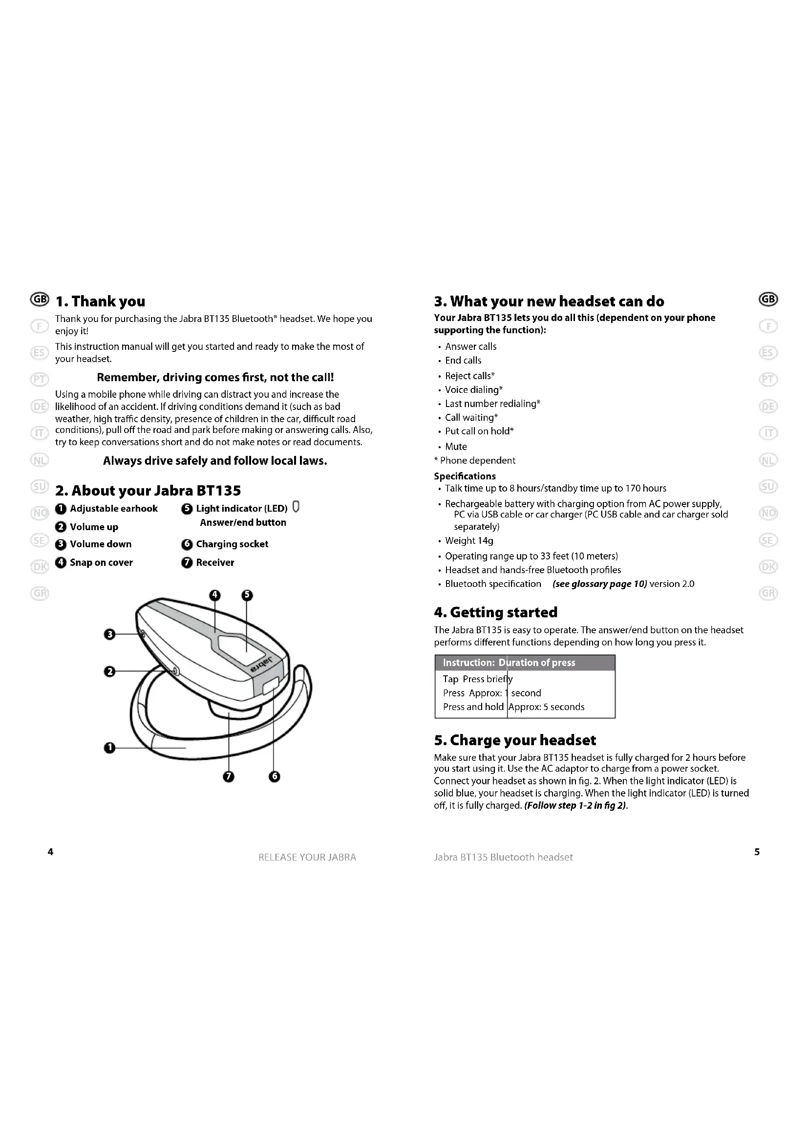 The Jabra BT135 is easy to operate. The answer/end button on the headset performs dierent functions depending on how long you press it. Instruction: Duration of press Tap Press briey Press Approx: 1 second Press and hold Approx: 5 seconds