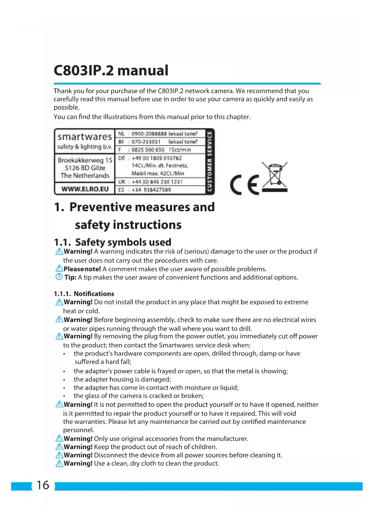 Download the instructions for your Surveillance Camera in PDF format for free! Find your manual C803IP.2 - ELRO and take your electronic device back in hand. On this page are published all the documents necessary for the use of your device. C803IP.2 by ELRO.