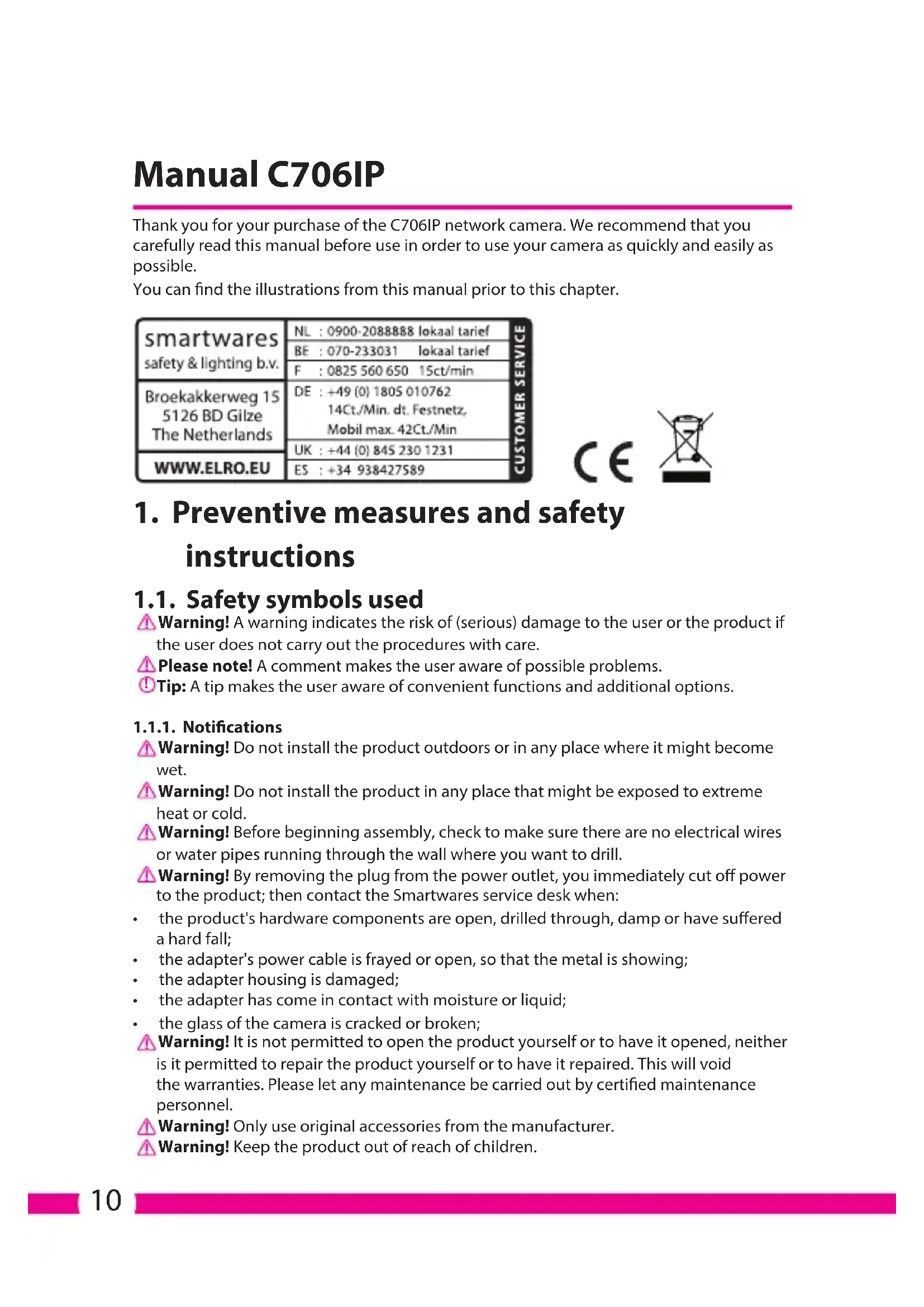 - the glass of the camera is cracked or broken; Warning! It is not permitted to open the product yourself or to have it opened, neither is it permitted to repair the product yourself or to have it repaired. This will void the warranties. Please let any maintenance be carried out by certied maintenance personnel. Warning! Only use original accessories from the manufacturer. Warning! Keep the product out of reach of children.11 Warning! Disconnect the device from all power sources before cleaning it. Warning! Use a clean, dry cloth to clean the product. Warning! Do not use any abrasive agents, corrosive cleaning products or any substances that contain bleach or solvents to clean the product. Warning! Remove the adapter from the power outlet during storms, lightning and whenever the product will not be used for a longer period of time. Please note! Install the product as indicated in this manual. If in doubt, consult a recognised technician and always take account of local installation codes and regulations. Please note! The camera should be kept out of direct sunlight. Please note! Do not point the camera at bushes, tree branches or other moving objects. Please note! The product must not be discarded as unsorted municipal waste, it must be disposed of separately. Please note! Find out about the options in your region for disposing of the product after use. Do not throw away electrical appliances or components, but see whether the product (components) can be turned in, recycled or reused. Please note! Wireless systems can be aected by interference from wireless telephones, microwave ovens and other wireless devices that operate in the 2.4 GHz range. Keep the product at least 3 metres away from any possible sources of interference during installation and operation. Please note! The camera is not able to view through glass at night. Keep this in mind when positioning it.