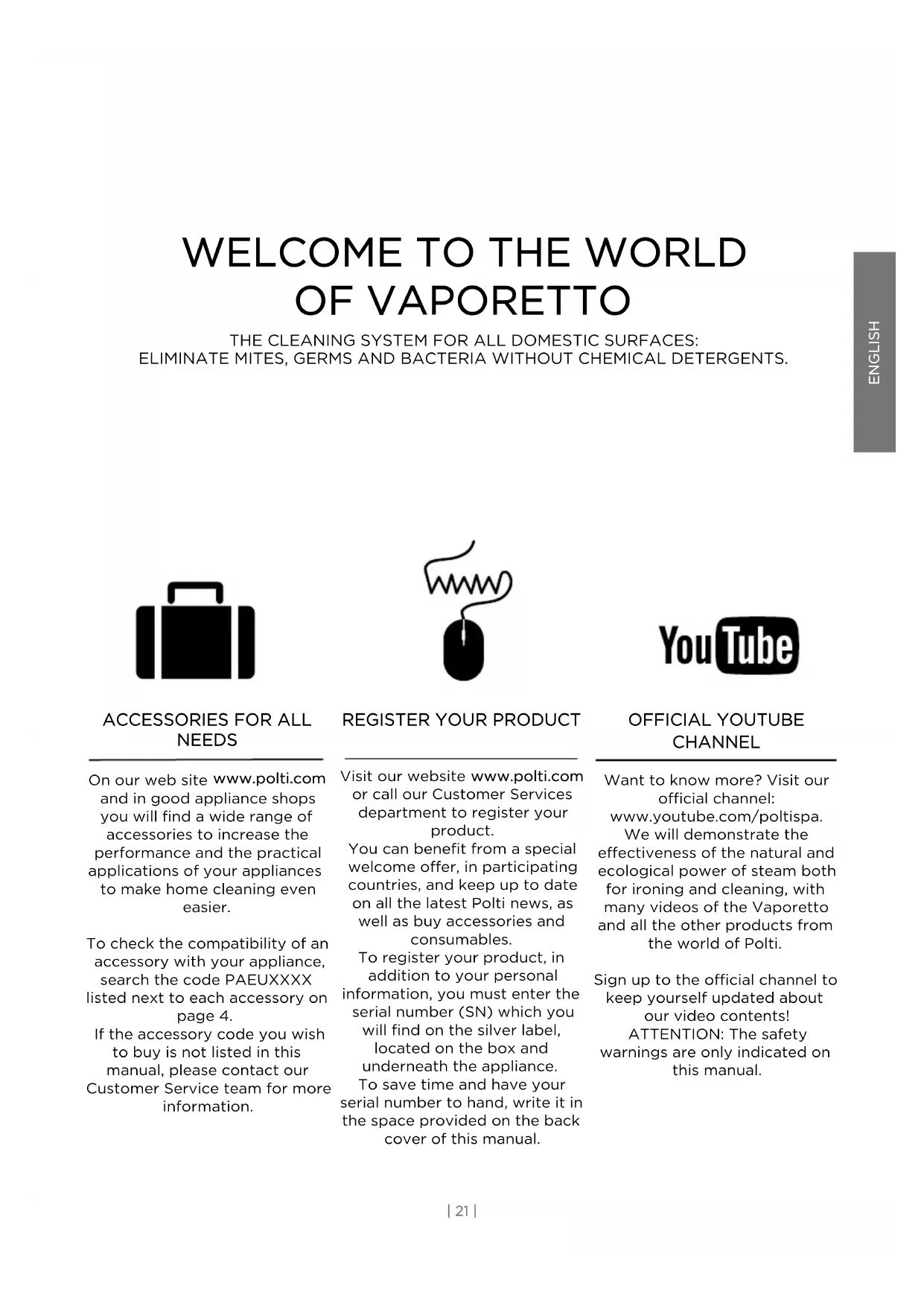 Visit our website www.polti.com or call our Customer Services department to register your product. You can benefit from a special welcome offer, in participating countries, and keep up to date on all the latest Polti news, as well as buy accessories and consumables. To register your product, in addition to your personal information, you must enter the serial number (SN) which you will find on the silver label, located on the box and underneath the appliance. To save time and have your serial number to hand, write it in the space provided on the back cover of this manual. OFFICIAL YOUTUBE CHANNEL Want to know more? Visit our official channel: www.youtube.com/poltispa. We will demonstrate the effectiveness of the natural and ecological power of steam both for ironing and cleaning, with many videos of the Vaporetto and all the other products from the world of Polti. Sign up to the official channel to keep yourself updated about our video contents! ATTENTION: The safety warnings are only indicated on this manual.SAFETY WARNINGS
