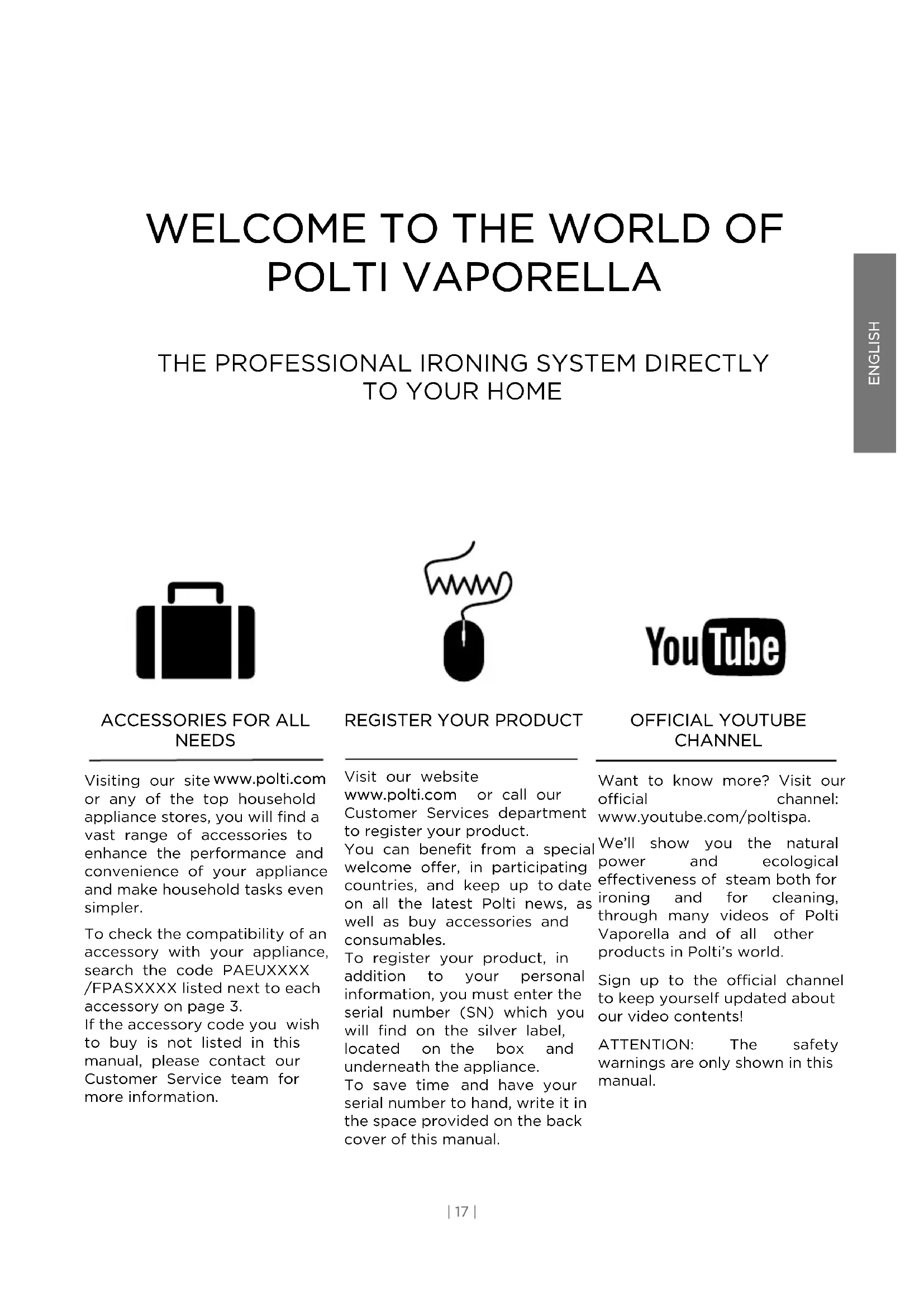 Visit our website www.polti.com or call our Customer Services department to register your product. You can benefit from a special welcome offer, in participating countries, and keep up to date on all the latest Polti news, as well as buy accessories and consumables. To register your product, in addition to your personal information, you must enter the serial number (SN) which you will find on the silver label, located on the box and underneath the appliance. To save time and have your serial number to hand, write it in the space provided on the back cover of this manual. OFFICIAL YOUTUBE CHANNEL Want to know more? Visit our official channel: www.youtube.com/poltispa. We’ll show you the natural power and ecological effectiveness of steam both for ironing and for cleaning, through many videos of Polti Vaporella and of all other products in Polti’s world. Sign up to the official channel to keep yourself updated about our video contents! ATTENTION: The safety warnings are only shown in this manual.SAFETY WARNINGS