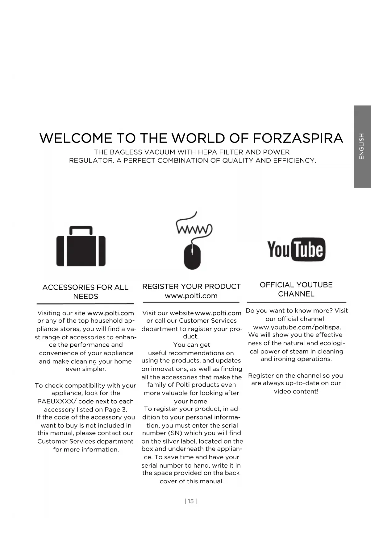 NEEDS Visiting our site www.polti.com or any of the top household ap- pliance stores, you will find a va- st range of accessories to enhan- ce the performance and convenience of your appliance and make cleaning your home even simpler. To check compatibility with your appliance, look for the PAEUXXXX/ code next to each accessory listed on Page 3. If the code of the accessory you want to buy is not included in this manual, please contact our Customer Services department for more information. OFFICIAL YOUTUBE CHANNEL Do you want to know more? Visit our official channel: www.youtube.com/poltispa. We will show you the effective- ness of the natural and ecologi- cal power of steam in cleaning and ironing operations. Register on the channel so you are always up-to-date on our video content!