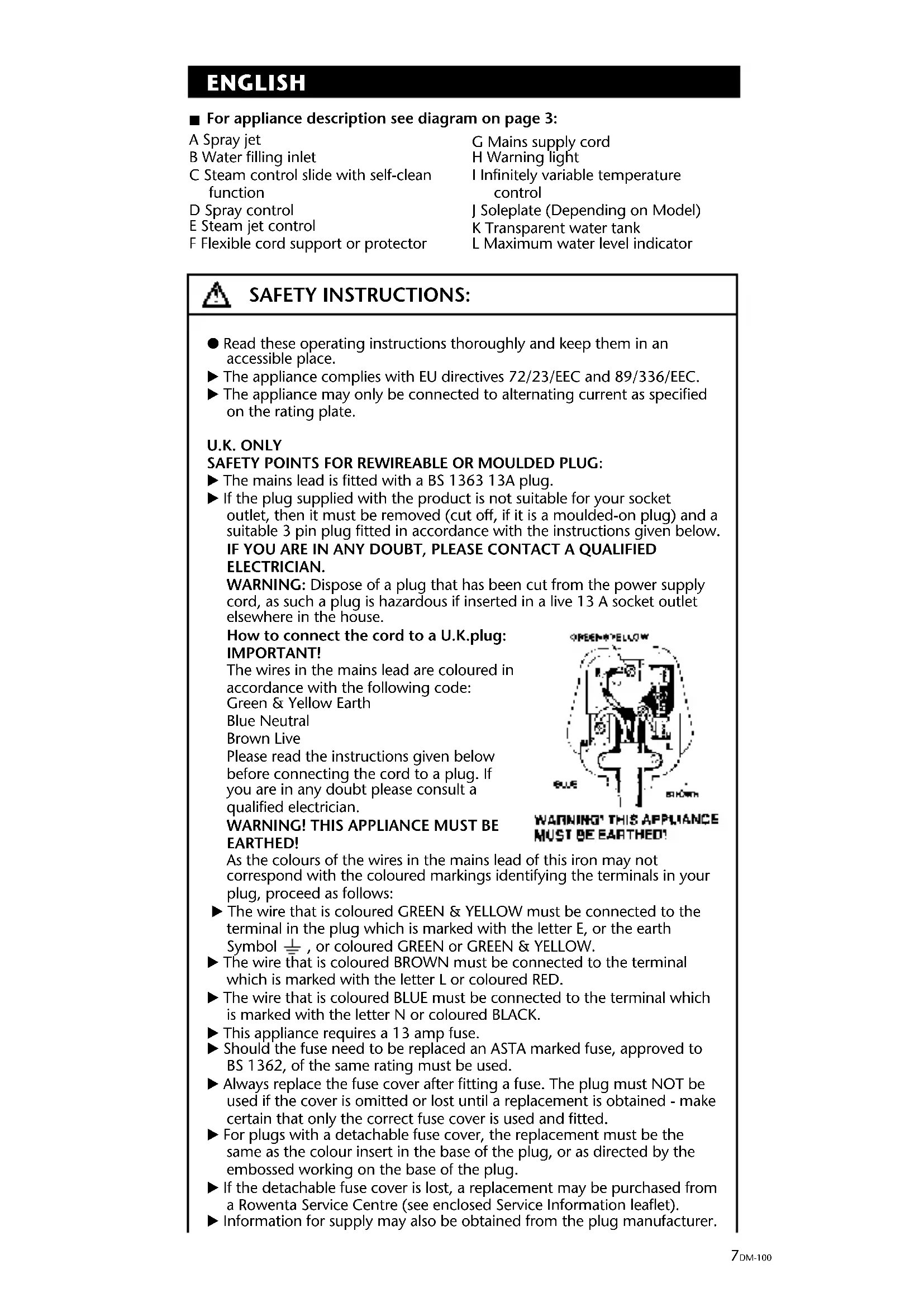 EARTHED! As the colours of the wires in the mains lead of this iron may not correspond with the coloured markings identifying the terminals in your plug, proceed as follows: E The wire that is coloured GREEN & YELLOW must be connected to the terminal in the plug which is marked with the letter E, or the earth Symbol , or coloured GREEN or GREEN & YELLOW. E The wire that is coloured BROWN must be connected to the terminal which is marked with the letter L or coloured RED. E The wire that is coloured BLUE must be connected to the terminal which is marked with the letter N or coloured BLACK. E This appliance requires a 13 amp fuse. E Should the fuse need to be replaced an ASTA marked fuse, approved to BS 1362, of the same rating must be used. E Always replace the fuse cover after fitting a fuse. The plug must NOT be used if the cover is omitted or lost until a replacement is obtained - make certain that only the correct fuse cover is used and fitted. E For plugs with a detachable fuse cover, the replacement must be the same as the colour insert in the base of the plug, or as directed by the embossed working on the base of the plug. E If the detachable fuse cover is lost, a replacement may be purchased from a Rowenta Service Centre (see enclosed Service Information leaflet). E Information for supply may also be obtained from the plug manufacturer.