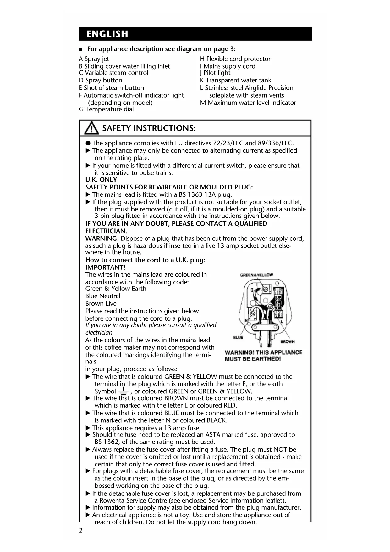 ENGLISH ■ For appliance description see diagram on page 3: A Spray jet B Sliding cover water filling inlet C Variable steam control D Spray button E Shot of steam button F Automatic switch-off indicator light (depending on model) G Temperature dial H Flexible cord protector I Mains supply cord J Pilot light K Transparent water tank L Stainless steel Airglide Precision soleplate with steam vents M Maximum water level indicator SAFETY INSTRUCTIONS: P The appliance complies with EU directives 72/23/EEC and 89/336/EEC. E The appliance may only be connected to alternating current as specified on the rating plate. E If your home is fitted with a differential current switch, please ensure that it is sensitive to pulse trains.