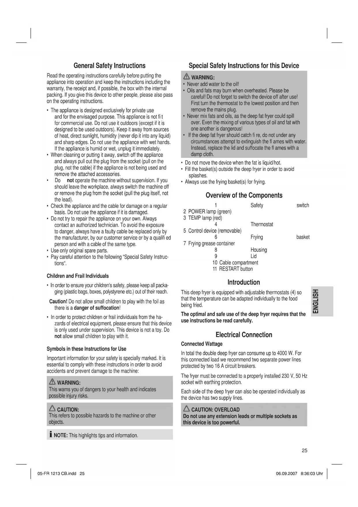 - Always use the frying basket(s) for frying. Overview of the Components 1 Safety switch 2 POWER lamp (green) 3 TEMP lamp (red) 4 Thermostat 5 Control device (removable) 6 Frying basket 7 Frying grease container 8 Housing 9 Lid 10 Cable compartment 11 RESTART button Introduction This deep fryer is equipped with adjustable thermostats (4) so that the temperature can be adapted individually to the food being fried. The optimal and safe use of the deep fryer requires that the use instructions be read carefully. Electrical Connection Connected Wattage In total the double deep fryer can consume up to 4000 W. For this connected load we recommend two separate power lines protected by two 16 A circuit breakers. The fryer must be connected to a properly installed 230 V, 50 Hz socket with earthing protection. Each side of the deep fryer can also be operated individually as the device has two supply lines. CAUTION: OVERLOAD Do not use any extension leads or multiple sockets as this device is too powerful. 05-FR 1213 CB.indd 2505-FR 1213 CB.indd 25 06.09.2007 8:36:03 Uhr06.09.2007 8:36:03 UhrENGLISH ENGLISH