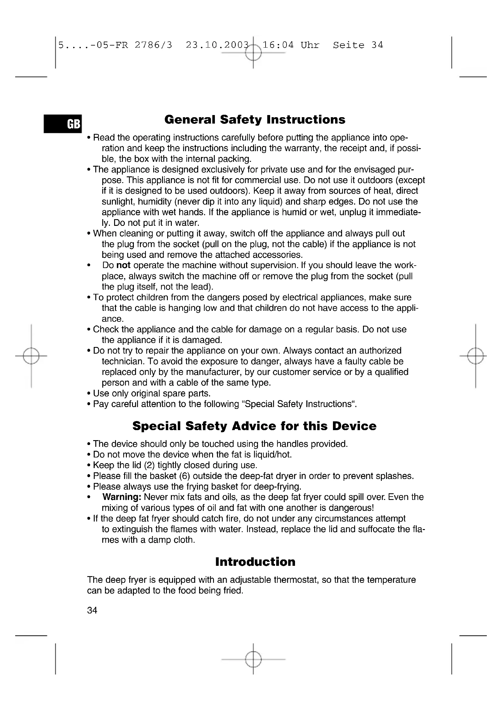 5....-05-FR 2786/3 23.10.2003 16:04 Uhr Seite 34The optimal and safe use of the deep fryer requires that the use instructions be read carefully. Connection The fryer must be connected to a properly installed 230 V, 50 Hz socket with eart- hing protection. Overview of Components 1 Control device (A-D) 6 Frying basket 2 Lid 7 Frying grease container 3 Handle (removable) 4 Viewing window 8 Odour and fat vapour filter cover 5 Housing 9 Restart button Putting into use Before using for the first time