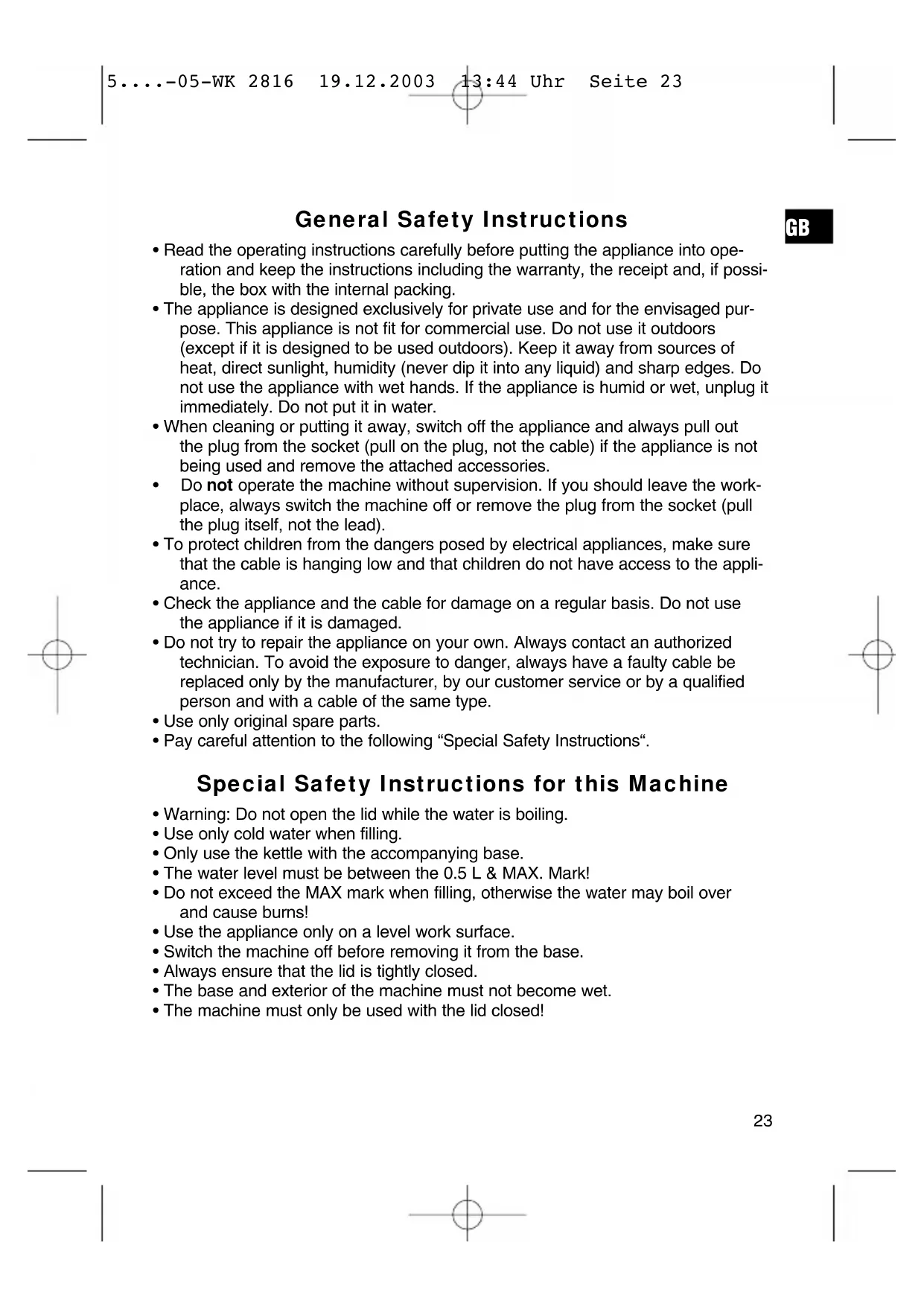 5....-05-WK 2816 19.12.2003 13:44 Uhr Seite 23First Use of the Machine Before using the machine for the first time water should be boiled in it twice without any additives. Do not use this water.