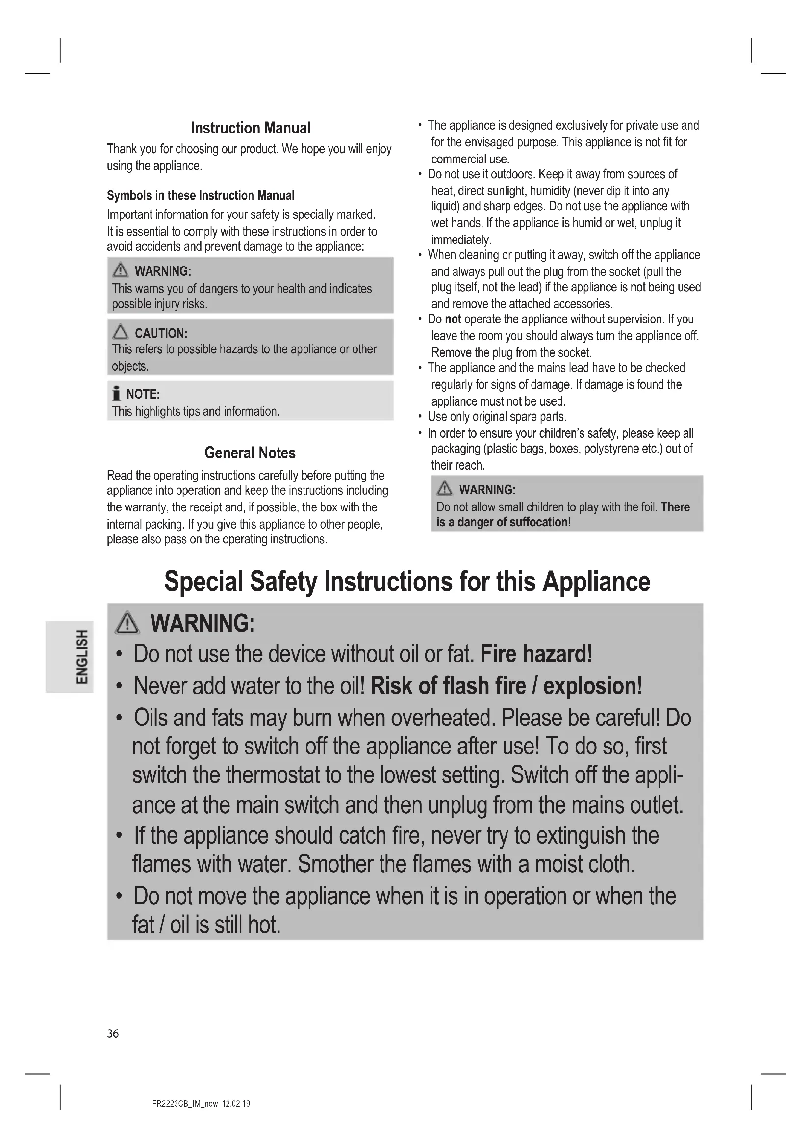 - Do not move the appliance when it is in operation or when the fat / oil is still hot.FR2223CB_IM_new 12.02.19