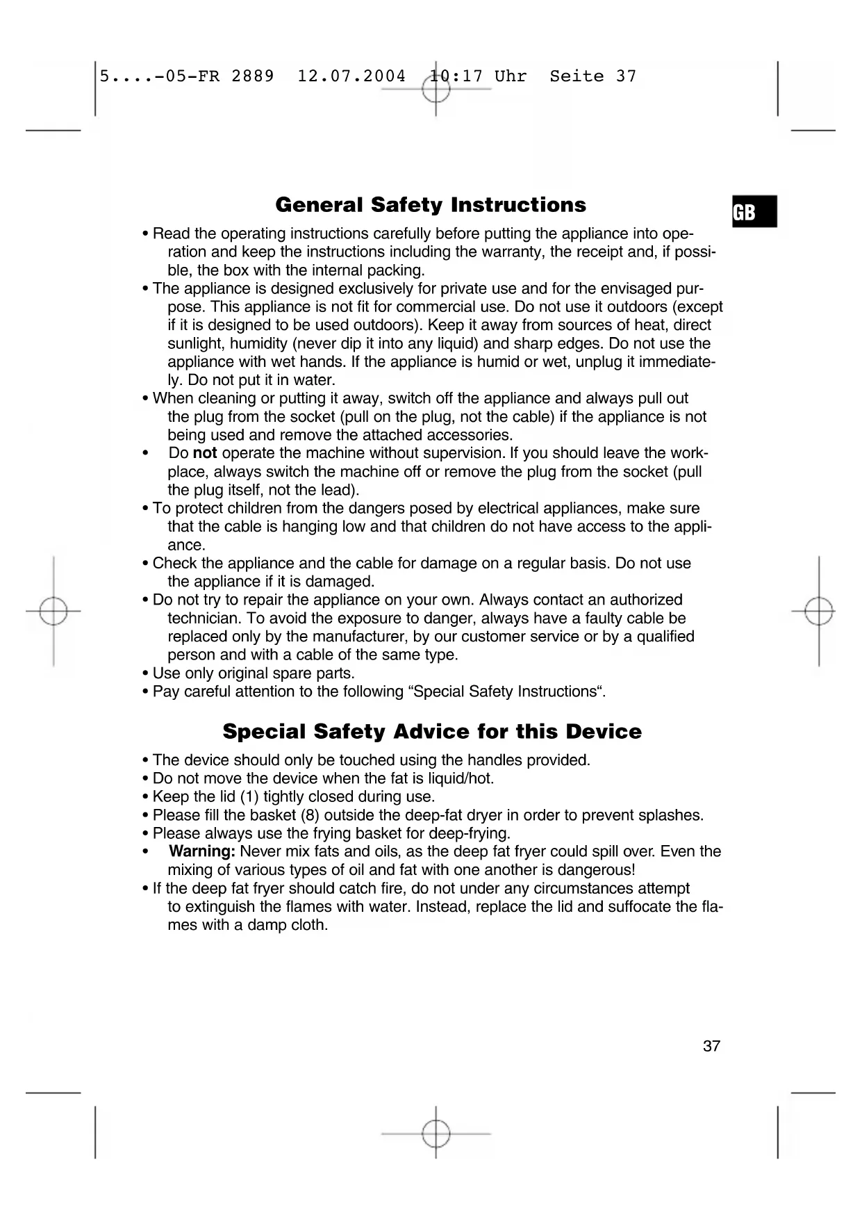 5....-05-FR 2889 12.07.2004 10:17 Uhr Seite 399. Avoid using abrasive detergents or sharp objects to avoid damaging the deep fryer! This device has been tested according to all relevant current CE guidelines, such as electromagnetic compatibility and low voltage directives, and has been constructed in accordance with the latest safety regulations. Subject to technical changes without prior notice! Guarantee The device supplied by our Company is covered by a 24 month guarantee starting on the date of purchase (receipt). During the life of the guarantee any fault of the device or its accessories *) ascriba- ble to material or manufacturing defects will be eliminated free of charge by repai- ring or, at our discretion, by replacing it. The guarantee services do not entail an extension of the life of the guarantee nor do they give rise to any right to a new guarantee! Proof of the guarantee is provided by the proof of purchase. Without proof of purchase no free replacement or repair will be carried out. If you wish to make a claim under the guarantee please return the entire machine in the original packaging to your dealer together with the receipt. *) Damage to accessories does not mean automatic free replacement of the whole machine. In such cases please contact our hotline. Broken glass or breakage of plastic parts are always subject to a charge. Defects to consumables or parts subject to wearing (e.g. motor pistons, kneading blades, drive shafts, spare remote control, spare toothbrushes, saw blades, etc.) as well as cleaning, maintenance or the replacement of said parts are not covered by the guarantee and hence are to be paid! The guarantee lapses in case of unauthorized tampering. After the expiry of the guarantee After the expiry of the guarantee repairs can be carried by the competent dealer or repair service against the payment of the ensuing costs.