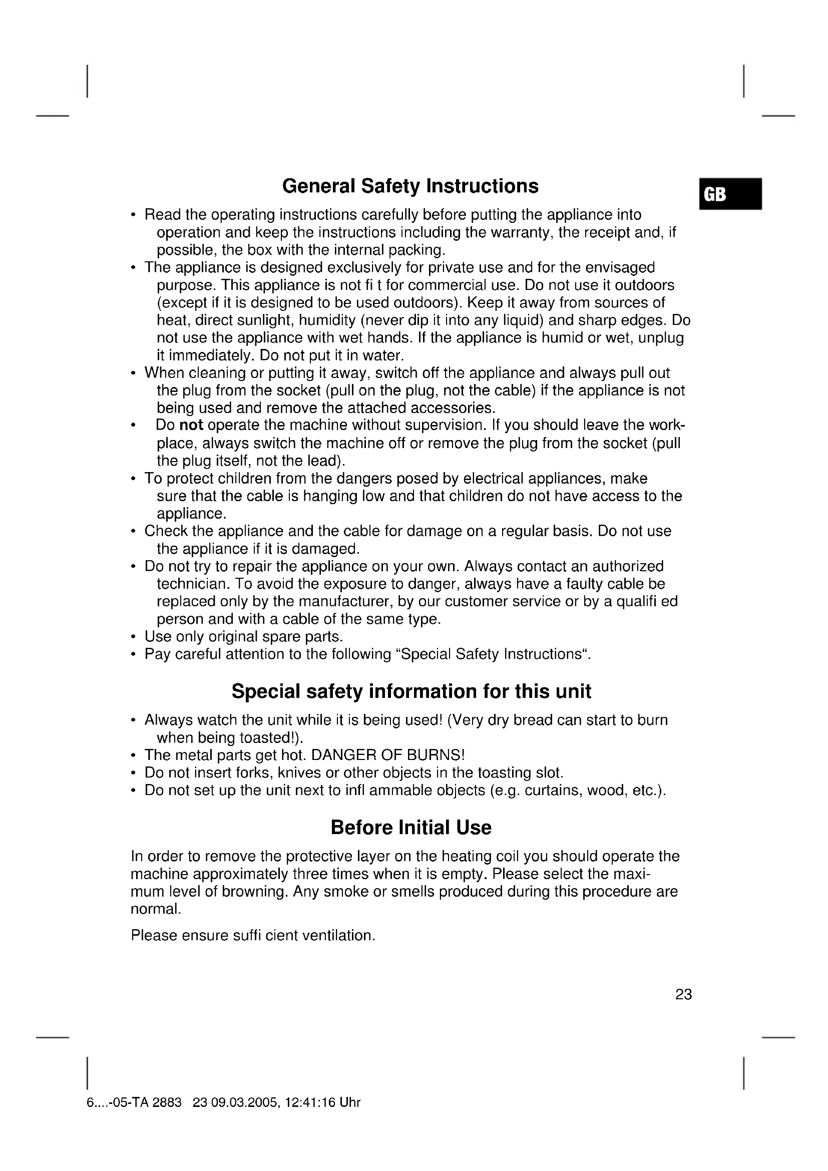 - Always watch the unit while it is being used! (Very dry bread can start to burn when being toasted!).