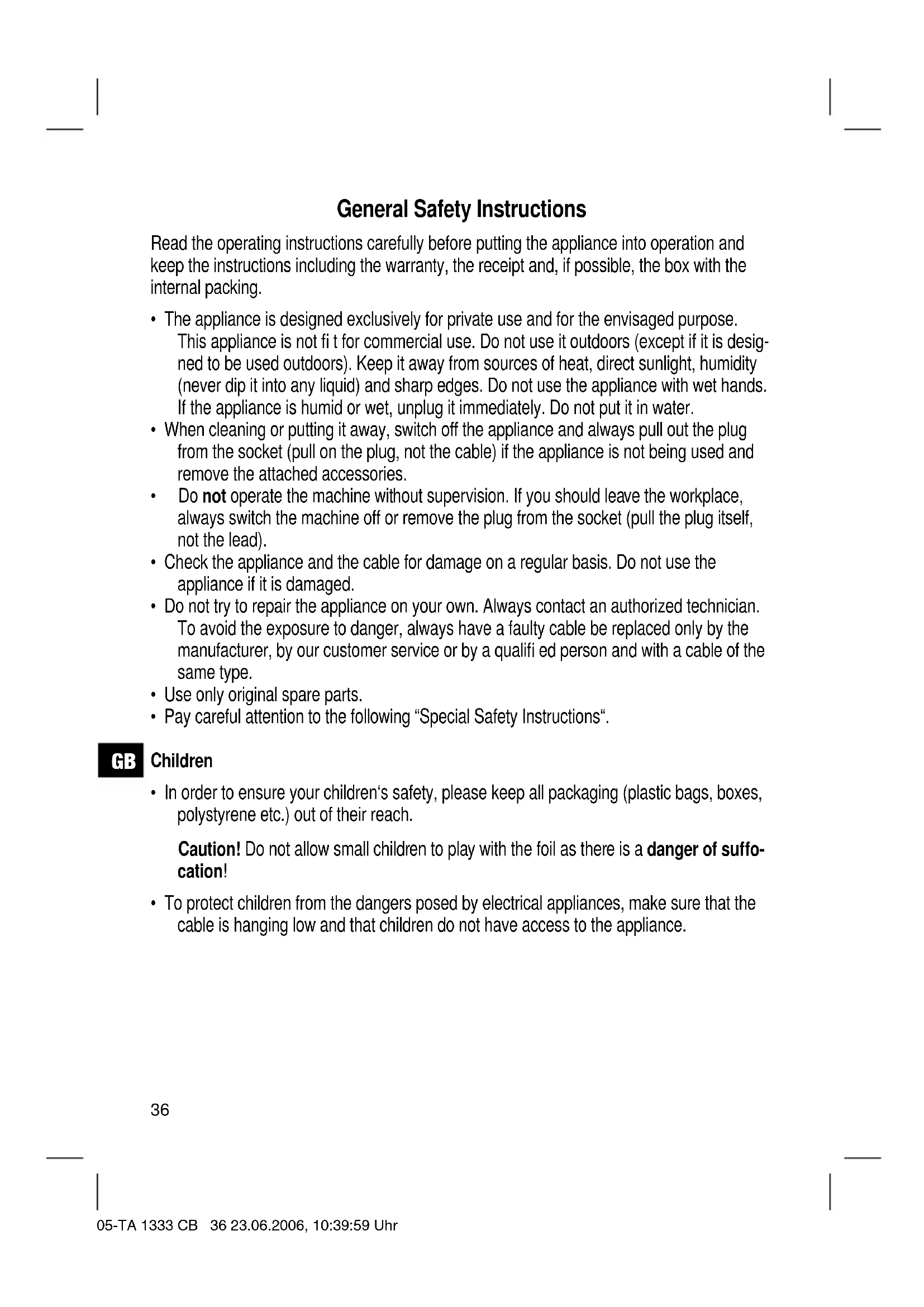 - Do not operate the machine without supervision. If you should leave the workplace, always switch the machine off or remove the plug from the socket (pull the plug itself, not the lead).