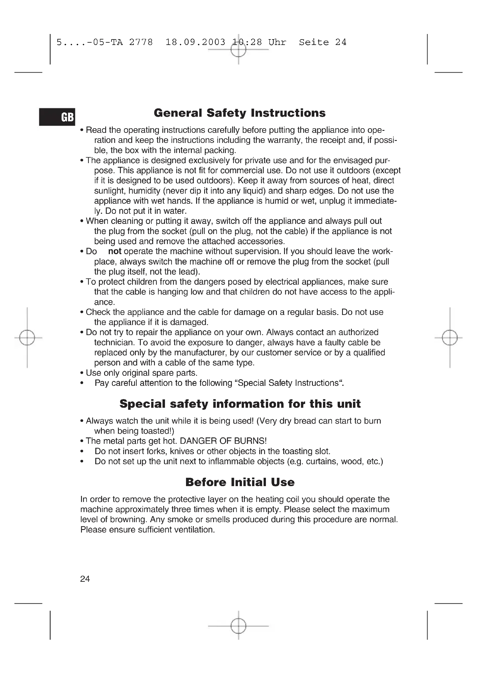 - Do not set up the unit next to inflammable objects (e.g. curtains, wood, etc.) Before Initial Use In order to remove the protective layer on the heating coil you should operate the machine approximately three times when it is empty. Please select the maximum level of browning. Any smoke or smells produced during this procedure are normal. Please ensure sufficient ventilation.