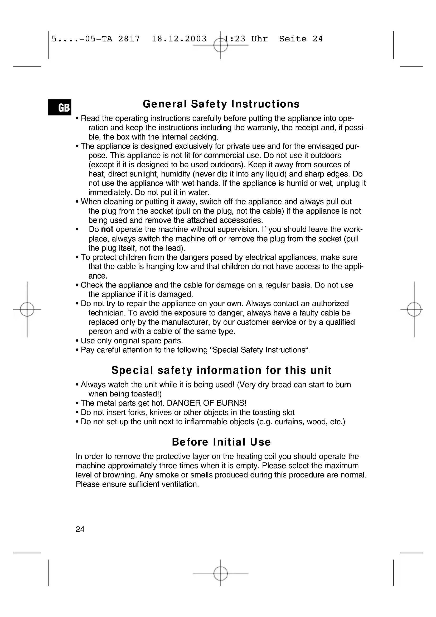 • Always watch the unit while it is being used! (Very dry bread can start to burn when being toasted!)