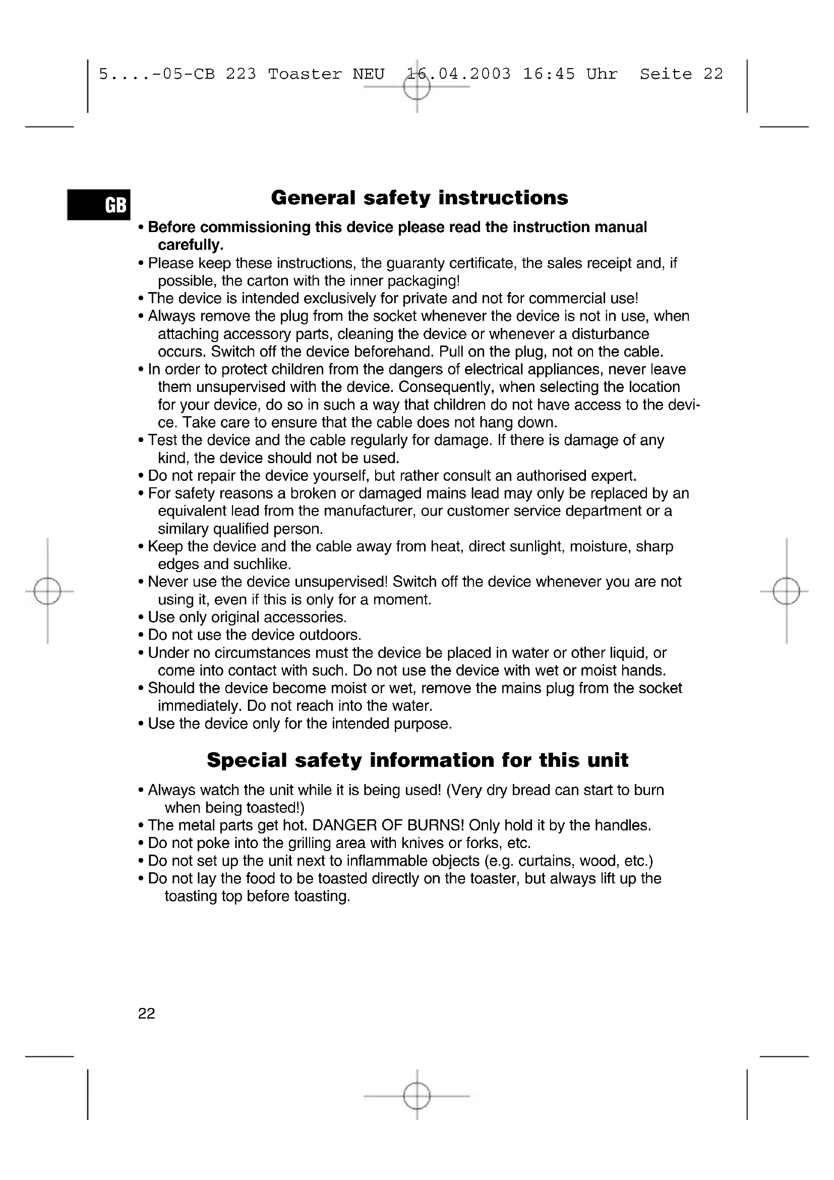 5....-05-CB 223 Toaster NEU 16.04.2003 16:45 Uhr Seite 23This appliance conforms with the CE directives for radio interference suppression and low-voltage safety and has been built to meet current safety requirements. Subject to technical changes without prior notice! Guarantee We undertake to guarantee the appliance sold by our company for 24 months as of the date of purchase (cash receipt). During the life of the warranty we shall provide for the repair or replacement of the appliance owing to material or manufacturing defects absolutely free of charge. Proof for the warranty is provided by the purchase document. The replacement and repair will not be performed free of charge without this proof of purchase. Should the warranty be valid, please consign the complete appliance in its original packing together with the cash receipt to your local dealer. You are not entitled to the replacement of the appliance owing to broken glass parts and faulty accessories. However, said parts will be replaced free of charge. In this case only the faulty accessory needs to be ordered without sending back the whole appliance! The cleaning, servicing and replacement of wear parts are not covered by this war- ranty and hence are to be paid for. The warranty is terminated in case of handling on the part of Third parties. After the warranty Once the warranty has expired, repairs can be carried out by specialized technici- ans or repair services against the payment of the service.