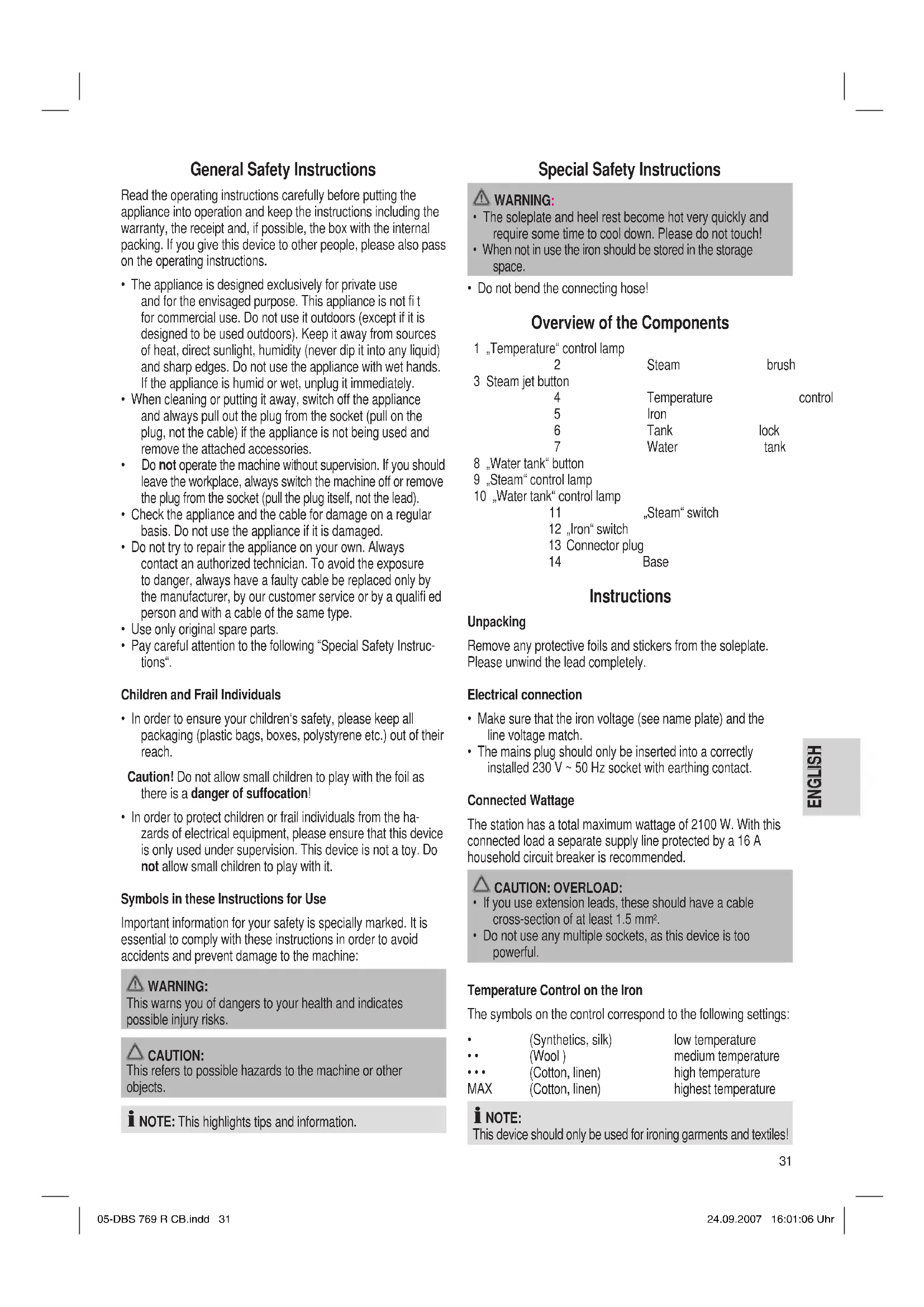 - Do not bend the connecting hose! Overview of the Components 1 „Temperature“ control lamp 2 Steam brush 3 Steam jet button 4 Temperature control 5 Iron 6 Tank lock 7 Water tank 8 „Water tank“ button 9 „Steam“ control lamp 10 „Water tank“ control lamp 11 „Steam“ switch 12 „Iron“ switch 13 Connector plug 14 Base Instructions Unpacking Remove any protective foils and stickers from the soleplate. Please unwind the lead completely. Electrical connection