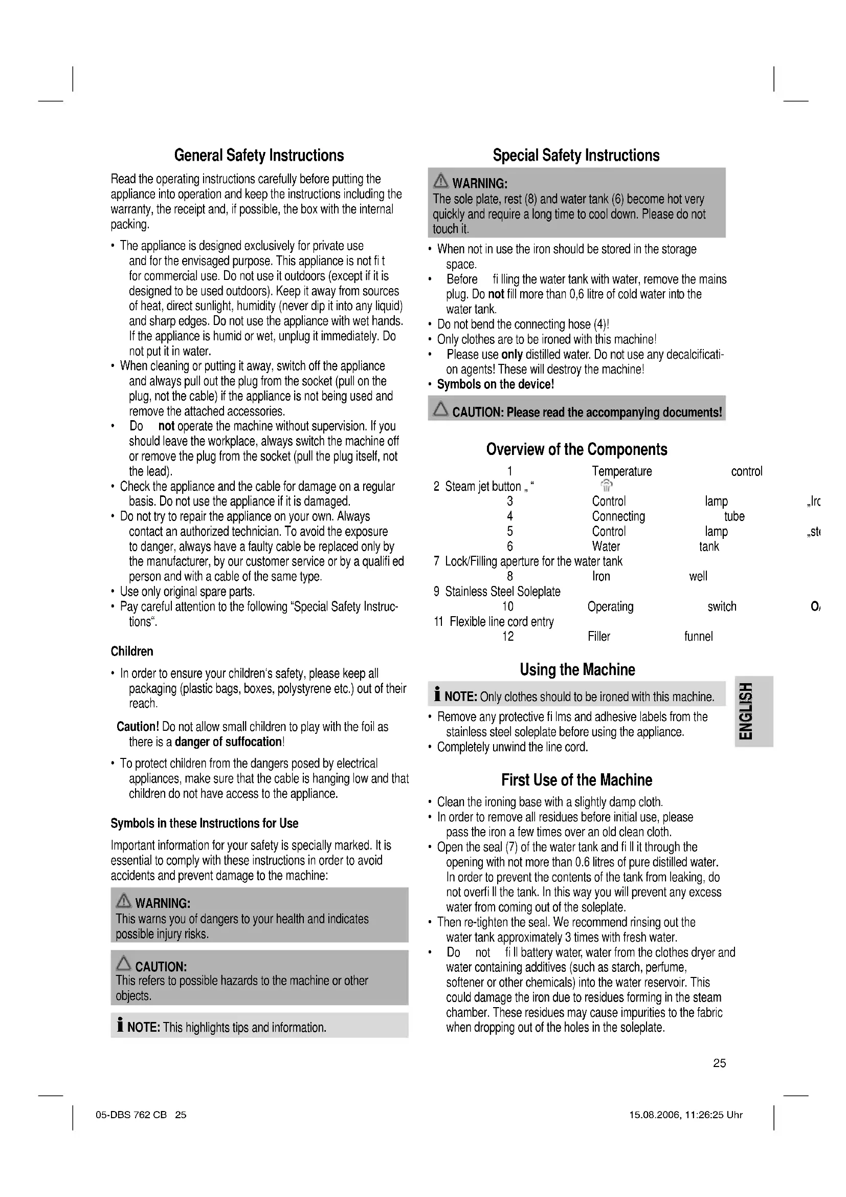 - Do not fi ll battery water, water from the clothes dryer and water containing additives (such as starch, perfume, softener or other chemicals) into the water reservoir. This could damage the iron due to residues forming in the steam chamber. These residues may cause impurities to the fabric when dropping out of the holes in the soleplate. 05-DBS 762 CB 25 15.08.2006, 11:26:25 UhrENGLISH ENGLISH